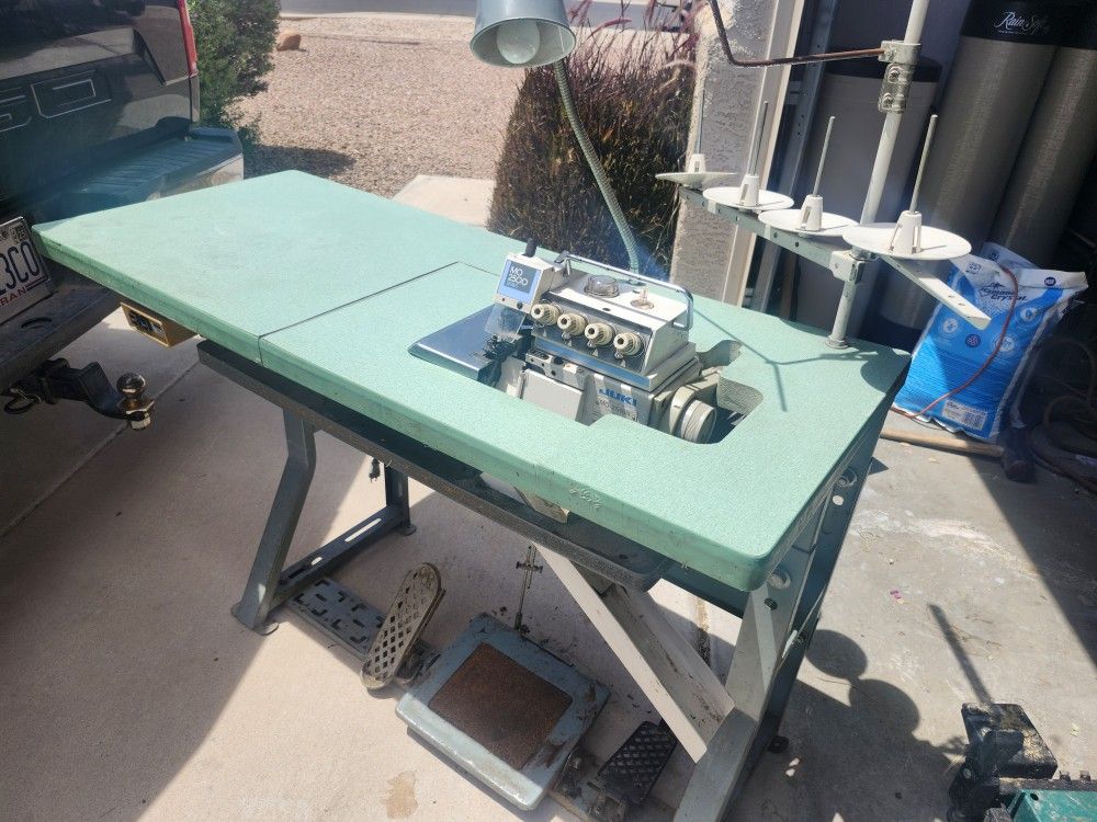 Used Juki 4-thread overlock serger sewing machine with table, motor, and light. Runs great. Manufactured at a time when Juki's machine quality and durability were legendary. Not like the new. cheap junk they have made in China these days.