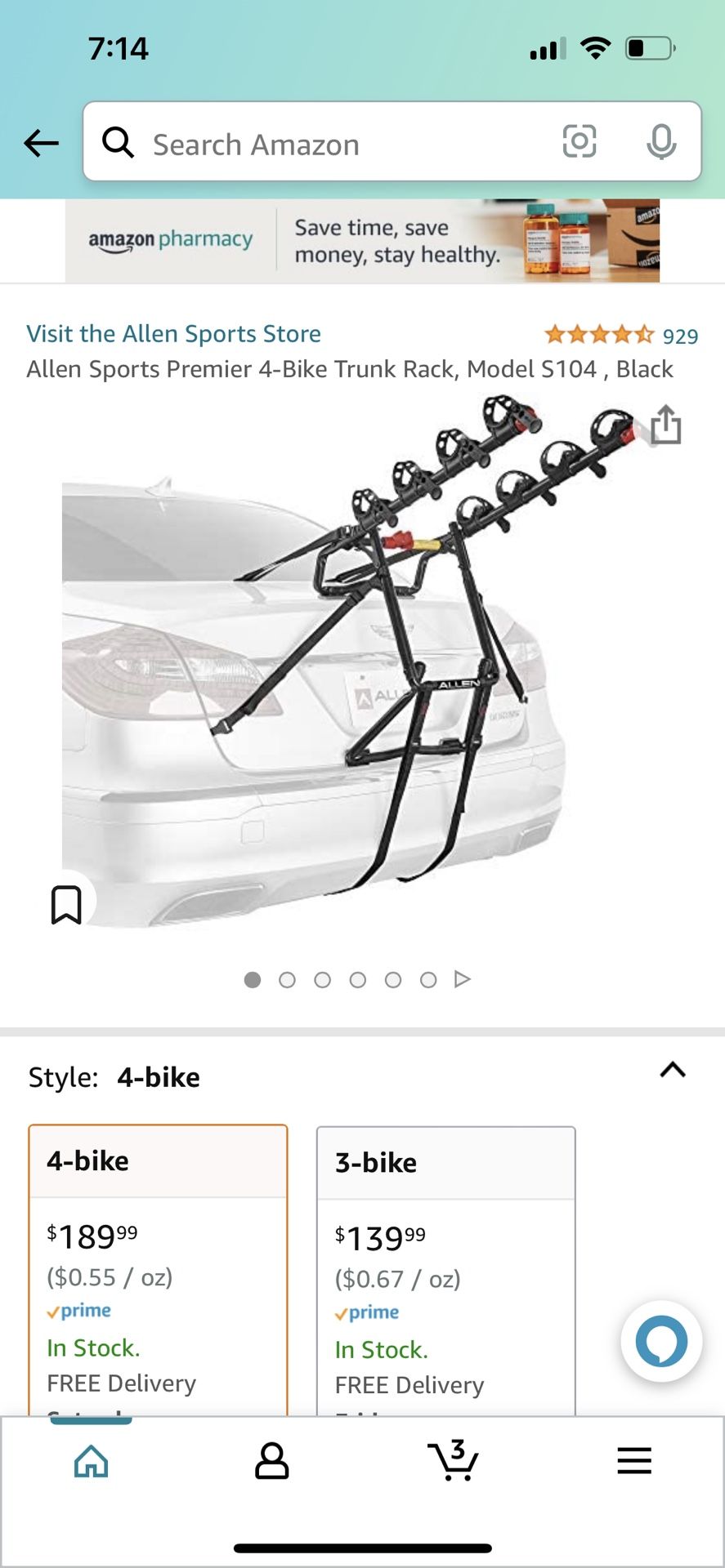 (NEW) Allen Sports Premier 4-Bike Trunk Rack, Model S104 , Black Fits wide variety of vehicles including some suvs. 4 bikes. Retails $190 + tax Delivery availability for free or small gas fee depending on your location