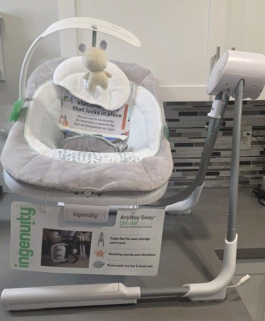 ( It's a rotating swing that only works by manual rocking; it has no mechanism, no music, only vibrations in the footrest. This product is new; it was from a store. It was used for display purposes, which is why it doesn't have an automatic swing system ormúsica.) Brand: Ingenuity Color: Spruce Material: Metal, Plastic, Polyester (50% metal, 35% plastic, 10% fabric), 5% polyester filling Product Dimensions 36.61" D x 28.35" W 26.38" x 26.38" (H) Item Weight 16.72 lbs Age Range (Description) 0-9 Months 52% Metal, 38% Plastic, 10% Fabric The Ingenuity AnyWay Sway Portable Swing rotates 180° and moves in 3 directions to keep baby comfortable and in sight; the gender-neutral print matches any décor and makes a great gift. 2 Modes of Use: The swing easily locks into place to become a stationary seat; 2 reclining positions while in stationary mode; soothing vibrations help calm baby in both seat and swing modes; removable, rotating toy bar with 1 plush bunny toy helps entertain.