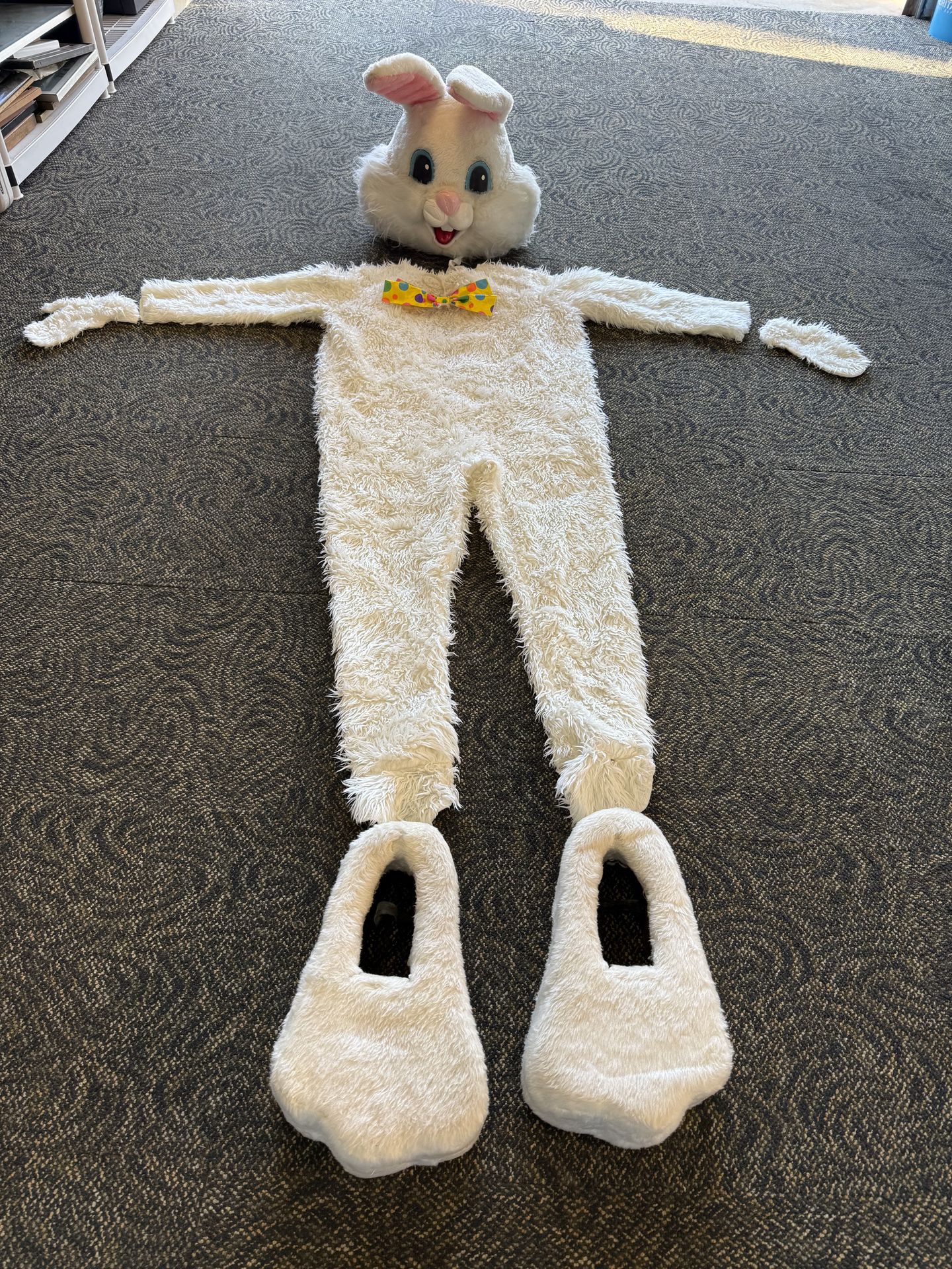 In time for Easter. Make memories with this adult sized Easter bunny costume. Ideal for someone 5’10” or shorter. Includes gloves, head and shoe coverings. Outfit has string and Velcro to close. A large basket will add to your Easter egg hunt fun.