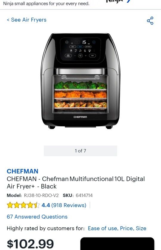 Chefman air fryer from best buy. I bout it but I did realize I dont need this airfryer. This is exellent for fast cooking. Cook with air and avoid using pan and oil. Exellent for healthy nutrition. Used it 2 times. The price in best buy is for $102 dollars. I am selling it for $80. It comes with all parts except the box.
