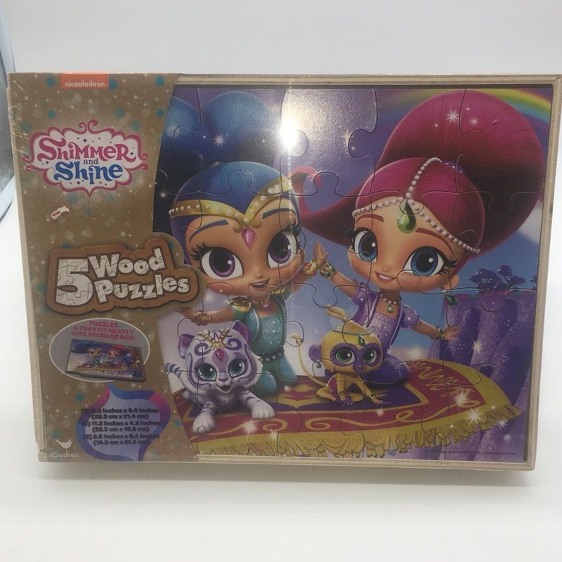 Brand New! Shimmer and Shine 5 Wood Puzzles in Wooden Storage Tray 2 - 12 piece Puzzles 2 - 16 piece Puzzles 1 - 24 piece Puzzle I WILL BUNDLE TOYS 1 - Wooden Storage Tray