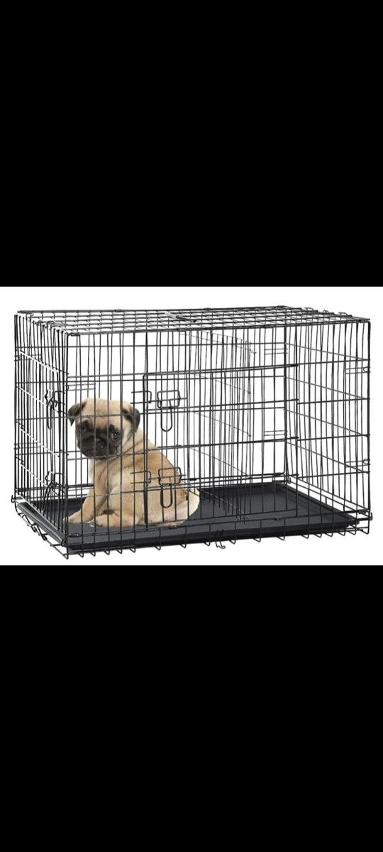 30" foldable dog crate with double doors and easy clean slide out bottom tray. Easy setup and storage. Brand new in box. Perfect for indoors or outdoors, home or travel.
