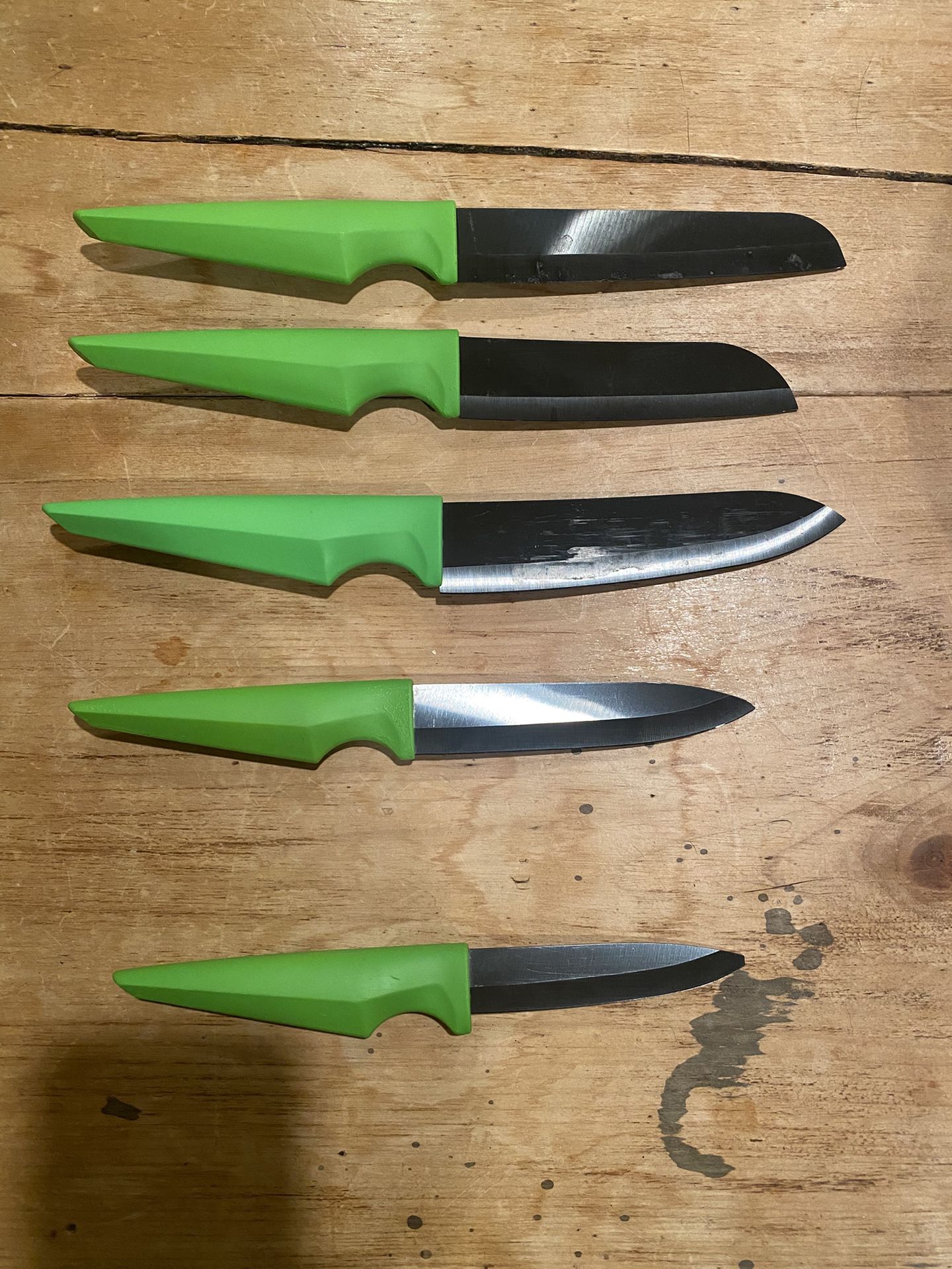 Set of used ceramic chefs knives with knife holder. Ceramic coating with some dings / chips.