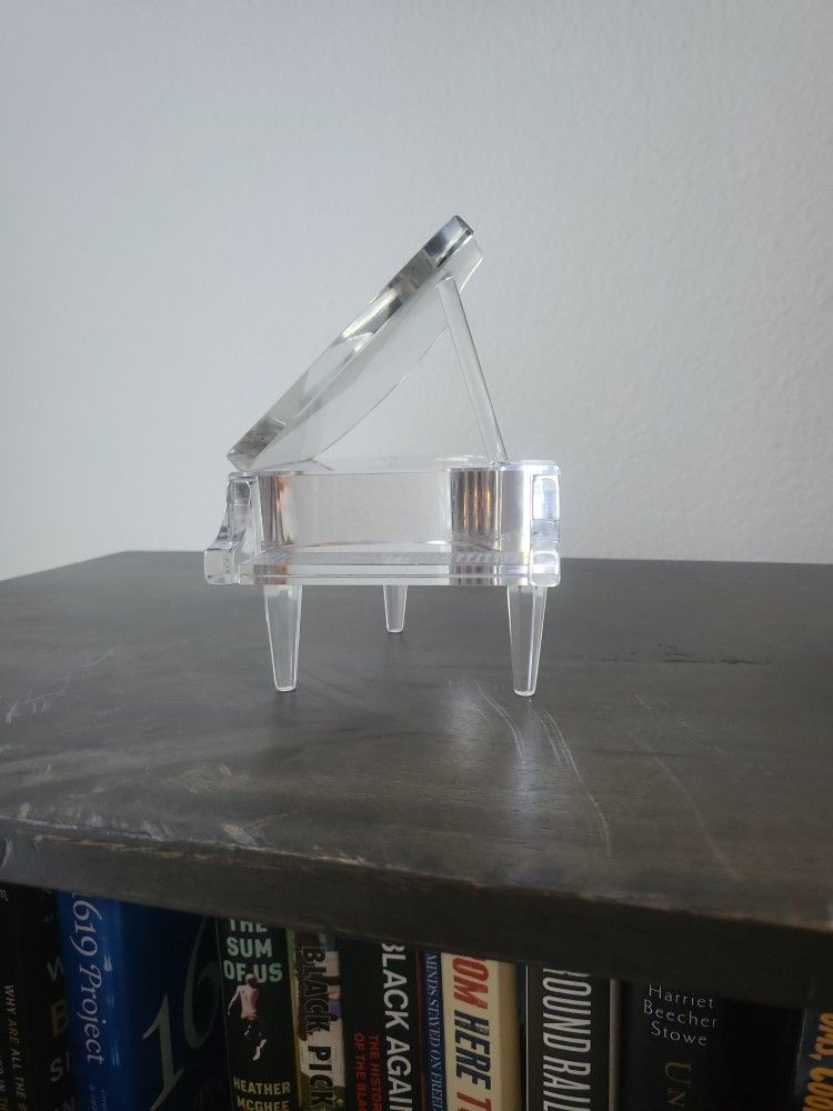 Glass piano shelf decorative item. About 5 inches vertically and 3.5 inches horizontally. Light weight. In perfect condition.