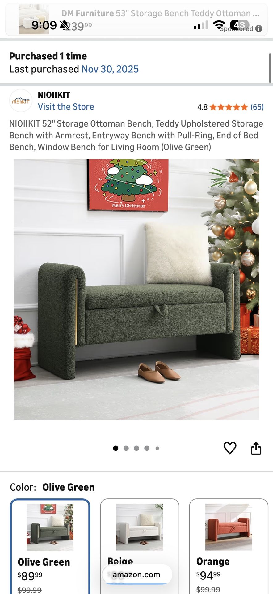 NIOIIKIT 52" Storage Ottoman Bench, Teddy Upholstered Storage Bench with Armrest, Entryway Bench with Pull-Ring, End of Bed Bench, Window Bench for Living Room (Olive Green)