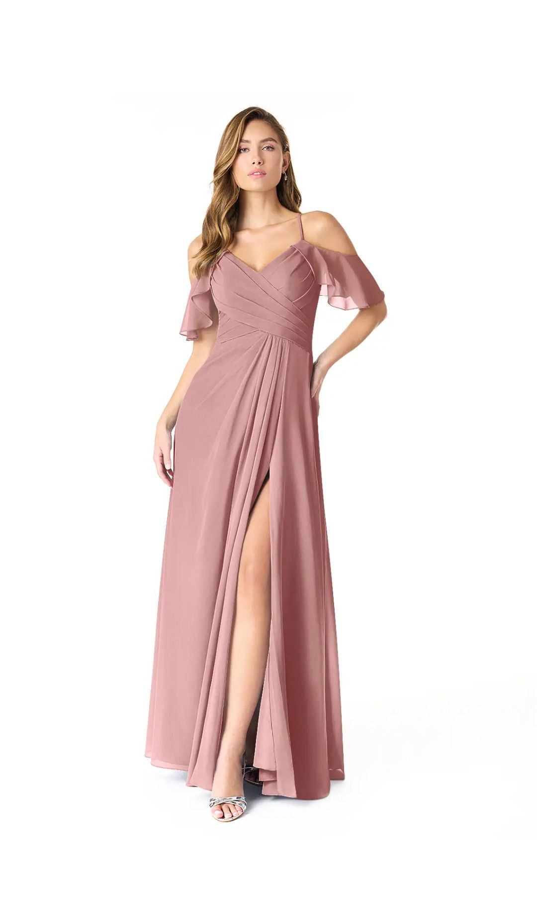 Dusty Rose chiffon dress size A2. Worn once. Garment bag included Bust:33 in Waist: 26.5 in Hips: 36.5 in Hollow to hem: original 58 in (was tailored 2 in. shorter) For reference, this was worn by a 5' 1" person with 2 inch heels. $40 or OBO