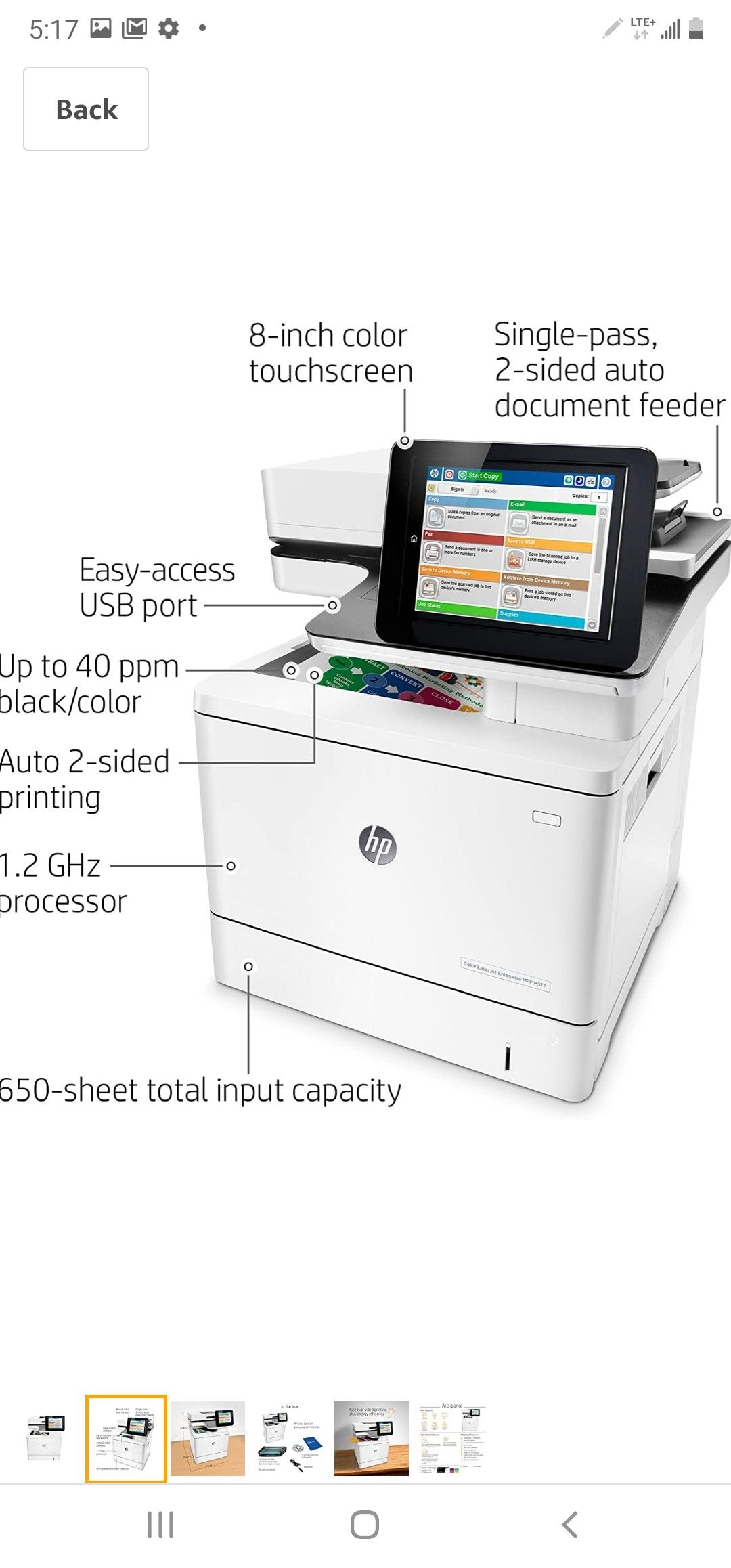 Business went under due to covid. Must sell everything to keep house. My loss is your gain. Description: Conserve energy, increase productivity, and work fast with the HP color LaserJet Enterprise MFP M577dn. This multifunction Laser Printer helps guard your printers with built-in, multi-level device security, and helps you centrally manage your fleet. Expect professional-quality documents and brilliant graphics with HP jet Intelligence Toner, print 2-sided documents as quickly as one, and scan both sides of the page at once. Features & details Streamlined efficiency – Print professional-quality documents with vivid images and graphics with the HP color LaserJet Enterprise MFP M577dn, A color duplex laser printer designed for high-speed performance and brilliant color output Built for speed – this multifunction color printer helps eliminate the wait from your workday, with automatic 2-sided printing and a 100-page automatic document feeder with single-pass, 2-sided scanning Centralize printing control – help build business efficiency with HP web jitadmin—easily add new devices and solutions, update features, and apply Corporate policies Protect sensitive data – Keep your fleet security covered and control device access with a full suite of embedded and optional HP jet advantage security solutions Easy, optional mobile printing – easily print from a variety of smartphones and tablets—generally no setup or apps required Keep energy use down – This duplex laser printer uses exceptionally low amounts of energy, thanks to smart, media-sensing technology and specially formulated toner Toner cartridges you can trust – avoid reprints, wasted Supplies, and service calls by using original HP 508a/508x toner cartridges designed for your color laser printer functions: Print, copy, scan