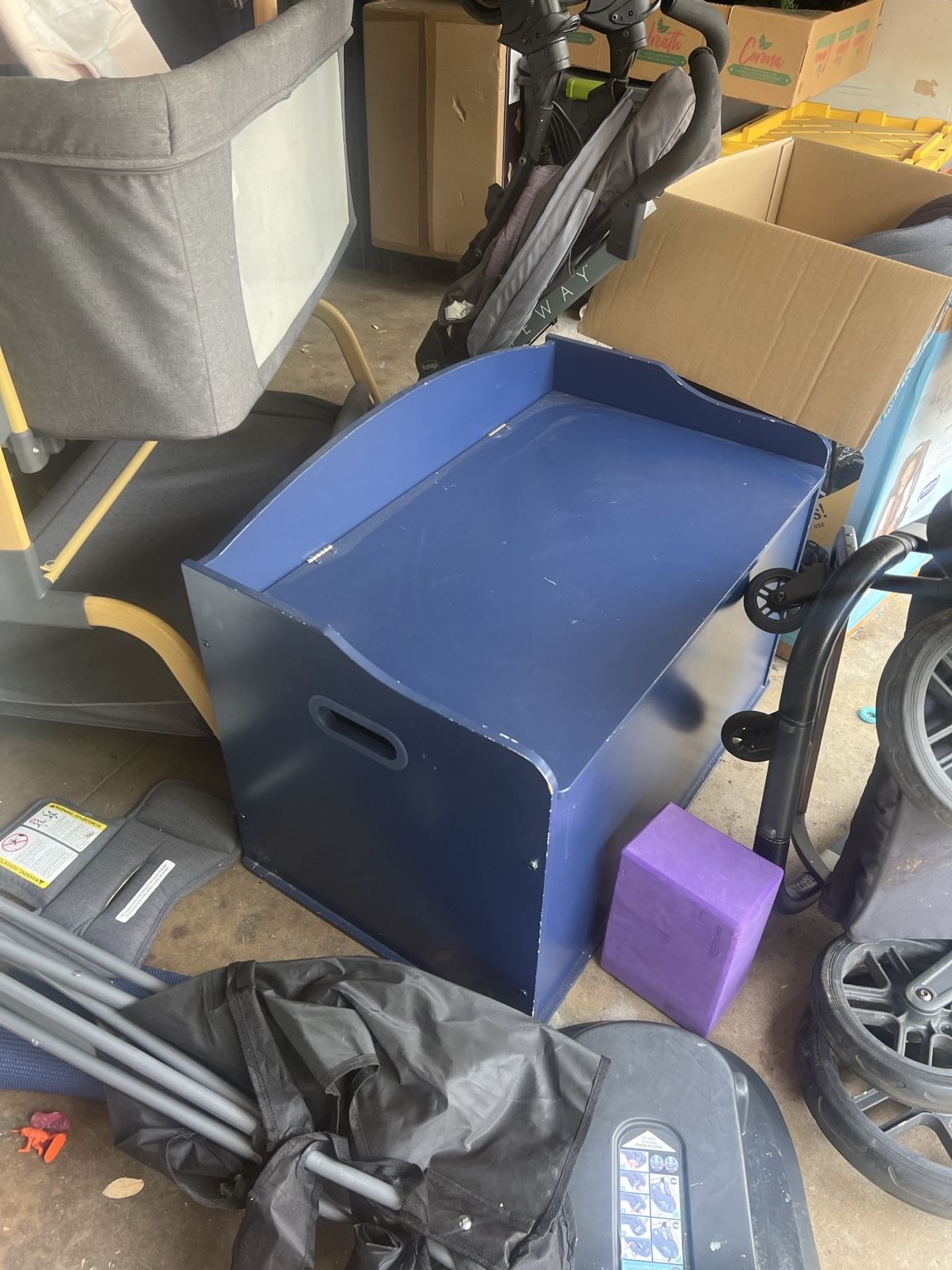 Sturdy wooden toy storage box in a deep navy blue color. Great for organizing toys, books, or stuffed animals while keeping everything easily accessible. Simple, clean design that works well in playrooms, bedrooms, or living areas. Features: • Solid and durable construction • Cut-out handles for easy moving • Open top for quick access • Generous storage space Shows some light cosmetic wear from normal use, but fully functional and sturdy.