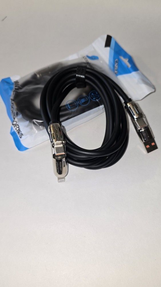 This 6 ft charger cable will ensure that you and the people around you have a charge. Not only is this cable a iPhone charger but also a USB Type-C Charger while on the other end there is a Regular USB and converts to a USB Type- C. The cable is made silicone and both ends are metal.
