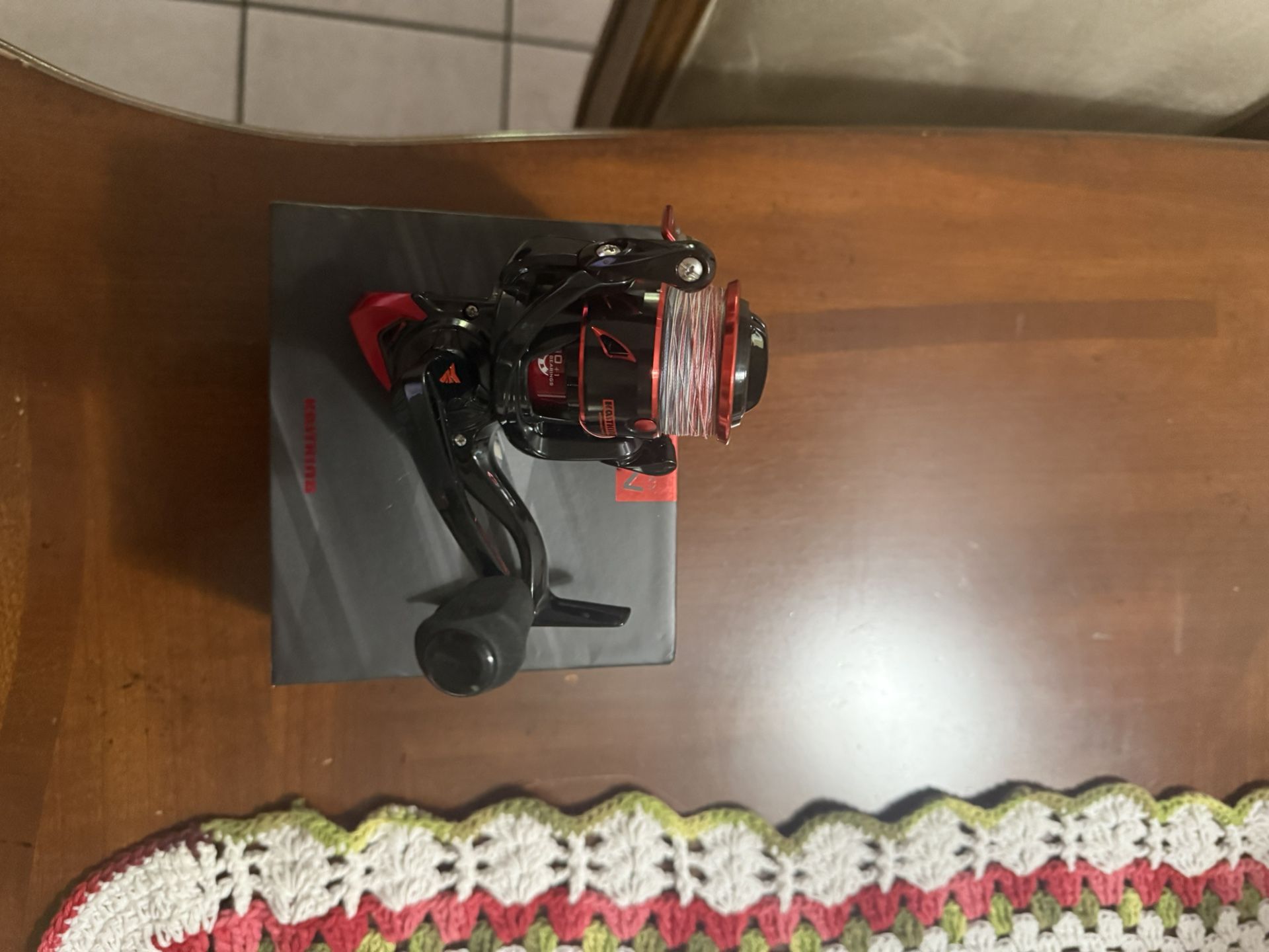 brand new reel no scratches at all with box and only the box has a few scratches. 3000 size with 4x strand 20 pound braid. 5-2-1 gear ratio