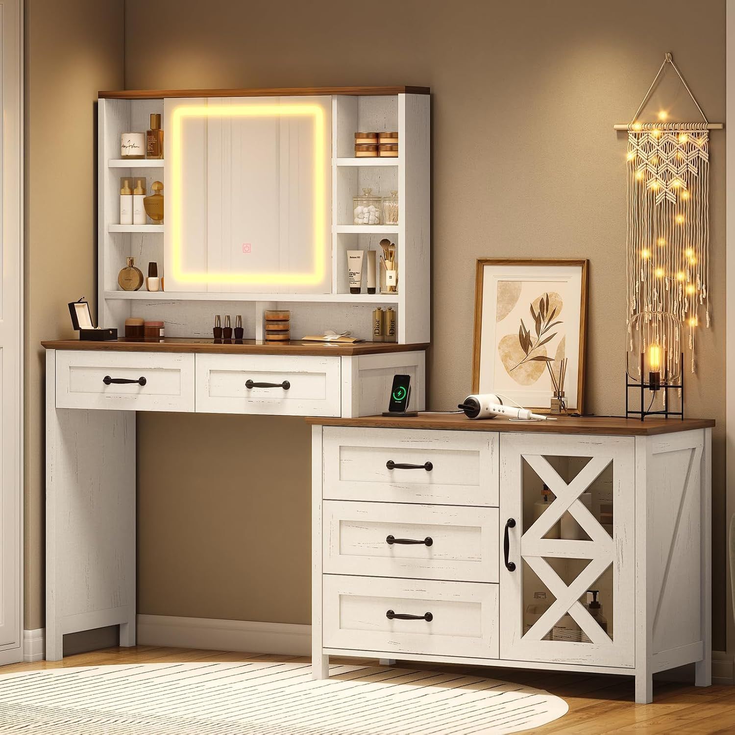 New In Box. Need to assemble it. Any car will fit. 20260220-1 Product Description: 【Visual Glass Desktop & Drawer Dividers】The vanity tabletop has a large piece of transparent tempered glass built into it, which can clearly display the items in the 2 drawers, making it easy to quickly find what you need, and the glass tabletop is easy to clean. Dividers in the drawers help you sort and organize items, and can be taken out if you don't need them. 【Smart LED Light Storage Mirror】The mirror of the makeup table has a built-in LED light strip, which is safer and more beautiful. You can control the light by touching the switch on the mirror. Touch to switch the light color: cold light, natural light, warm light. Press and hold to adjust the light brightness. Opening the mirror reveals 3 layers of hidden storage shelves. 【Equipped with Power Strip】The right desktop of the vanity table is equipped with a standard power strip that includes 2 AC outlets and 2 USB ports, making it easy to connect a hair dryer or curling iron, as well as charge cell phones, tablets, or other electronic devices. 【Farmhouse Vanity Desk】The makeup desk is finished in a two-tone design of weathered white and distressed wood grain brown, highlighting the vintage charm. The combination of a barn door element with modern glass on the right adds to the charm and elegance of a farmhouse. 【Vanity and Dresser 2 in 1 Design】The right side of the makeup vanity is designed as a dresser, providing you with more storage space (spacious table top, 3 large drawers and 1 cabinet). You can also use it next to your bed as a nightstand.