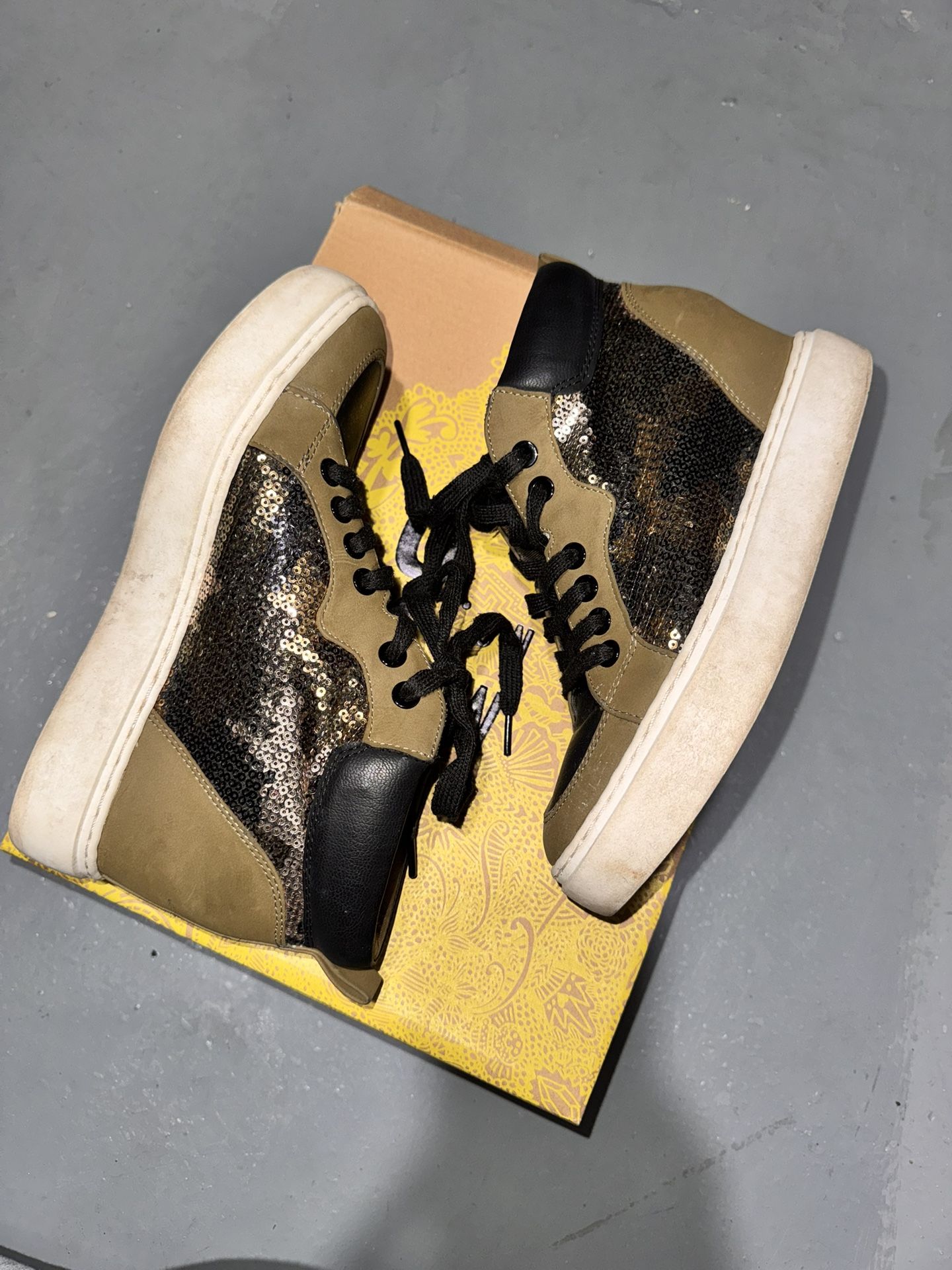 Camouflage sequin, army green. About 2 1/2 inch added height. As is. Pickup Follow me, I’m purging a lot of stuff. And act fast. I will donate everything if nobody is interested. Pick up only.