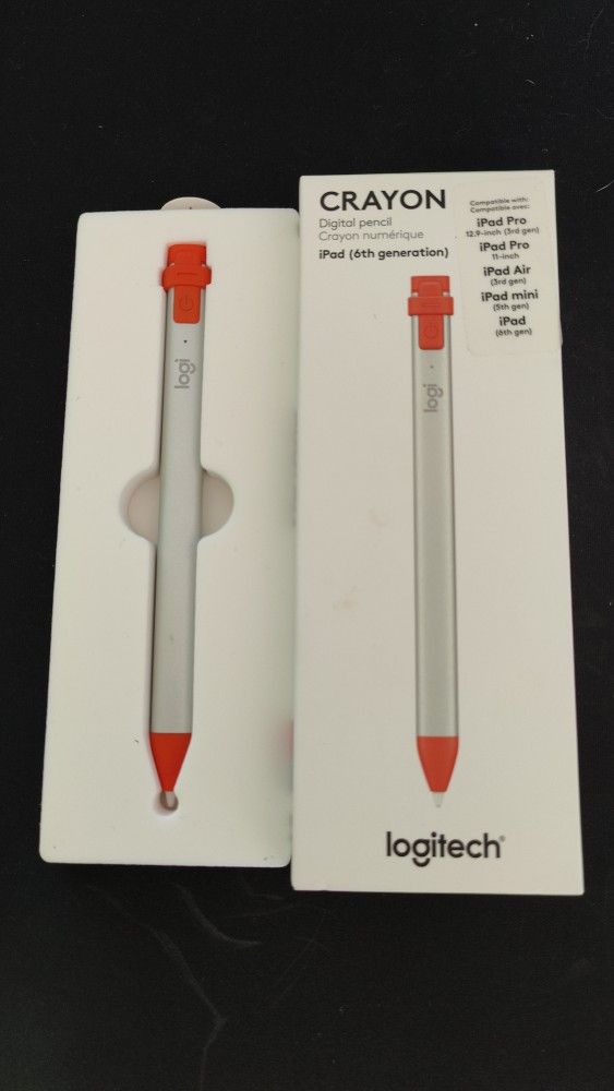 Lightly used but well taken care of, Logitech Crayon. A versatile, pixel-precise digital pencil for all iPads (2018 and later) that boosts productivity and lets you get creative. Mark up PDFs, take handwritten notes, or sketch diagrams. Up to 7 hours of active writing time Automatically powers off after 30 minutes of idle time to preserve battery On/off button requiring 1 sec press, Charge via iPad lightning cable Charging port covered by a replaceable tethered cap Tips are replaceable, tilt sensitivity for dynamic line weight, palm rejection technology, ignores stray touches Materials: Tube: Aluminum Cap: Silicon Rubber Tip cover: PC+ABS