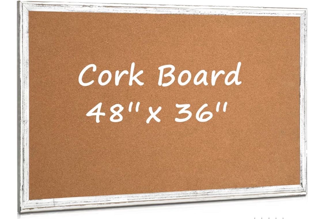 ***Appears to be new in box*** Large Cork Board】This large 48" x 36" bulletin board provides a large display space, perfect as an office or school bulletin. Comes with all mounting hardware and 10 push pins. You can use the cork bulletin board in the office, home, kitchen, school, personal studio and more 【Well-made Wooden Frame】Our white cork board features a precision-crafted frame, which is sturdy and durable. And the rustic white frame adds a touch of elegance to your space. The wooden frame has smooth edges to protect your hands from scratches 【Easy To Install】The back frame has pre-punched holes on both sides for hook installation. Following the super simple instructions, you can easily hang the pin board horizontally or vertically to suit your placement 【Easy to Pin】Made of premium dense cork, it‘s easy to pin and self-heal pinholes. After you pull the pushpins out, the self-healing ability of the cork board makes the hole become smaller. The cork board is thickened to resist punctures and will not crack after long-term use 【Multi-Purpose Usage】Pin memos, notes, photos, schedules, documents, notices, artwork or other decorations for your tasks and projects, or use it as a message board, vision board, display board, photo board, picture board