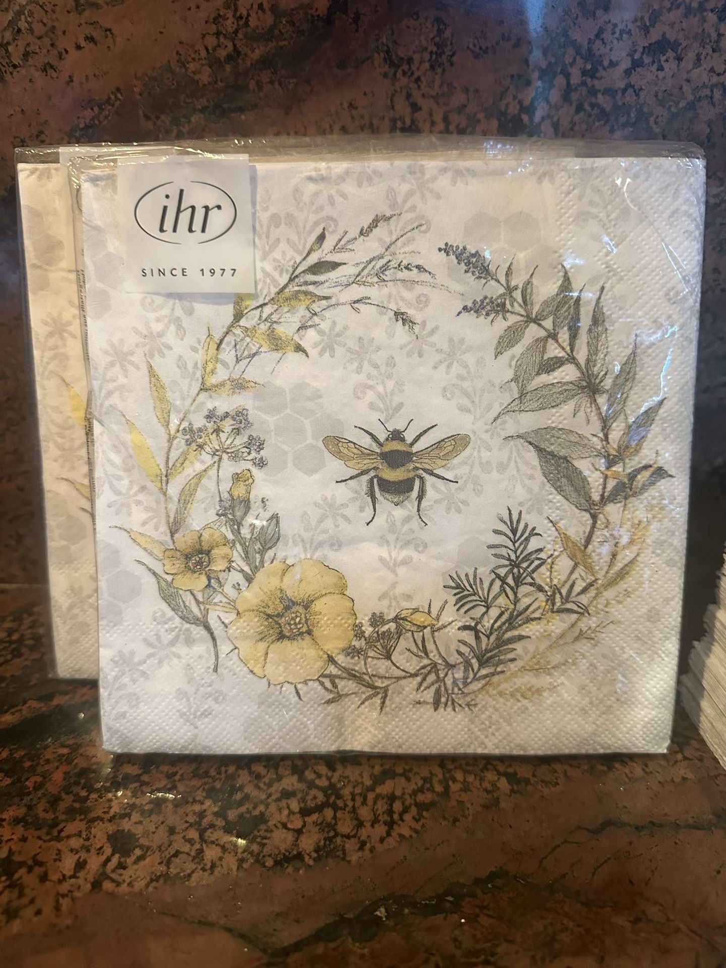 Napkins were opened during event prep time, but never used. 3-ply. Beverage/Dessert Napkins: 5” x 5”: Lunchen/Dinner Napkins: 6.5” x 6.5”. I have two unwrapped large size. Each package is 20 napkins (for a total of 40). I am estimating the stack next to it to be equal to 60 napkins. The first stack of the beverage napkins (on the left) is 20 napkins (hand counted). I am estimating there to be 70 beverage napkins. Other bee theme items listed under separate listings. Many of the items coordinate with the napkins.