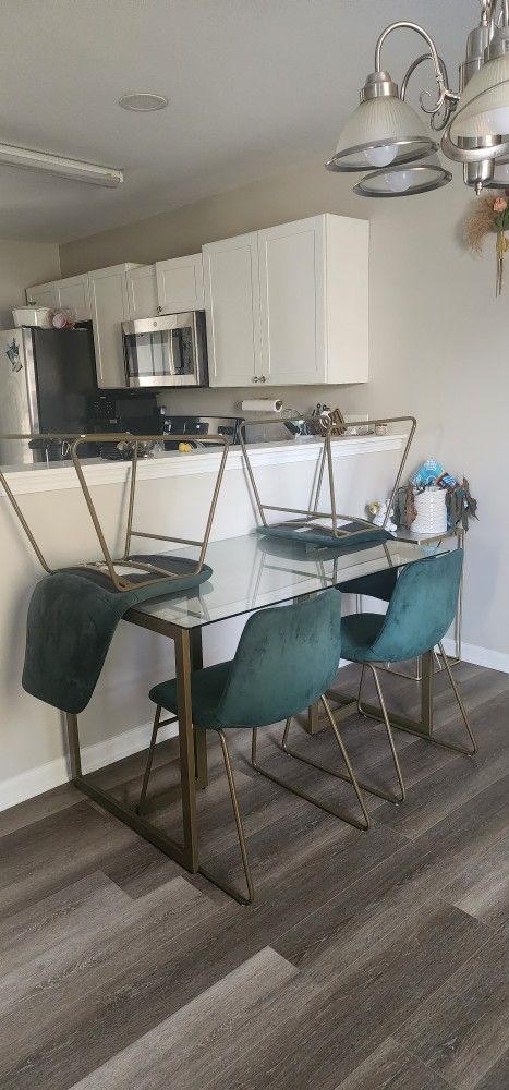 Glass Dinner Table With Brass Colored Hardware And Green Velvet Chairs
