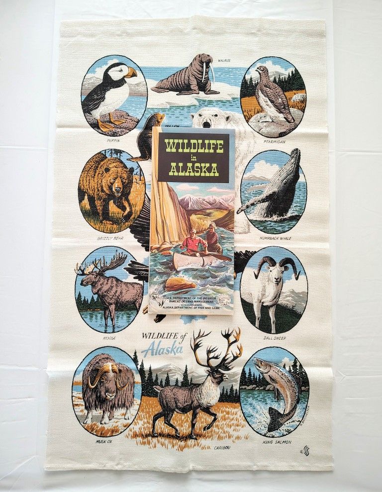 Vintage Alaska Memorabilia Wildlife Tea Towel And Wildlife Map From The 70/80s