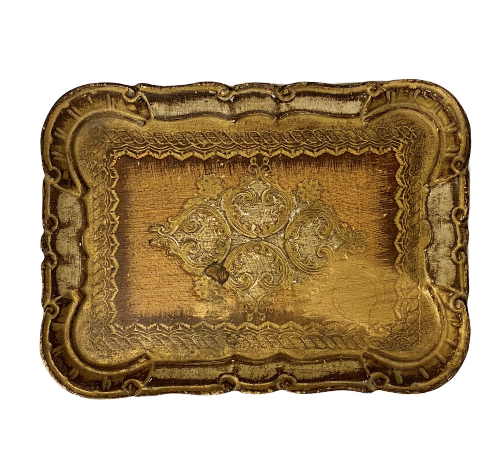 Vintage Antique OFM Florence Italy Gold Ornate Wood Tray Approximate Dimensions: 11 1/2” length x 8 1/2 inch height As-is, surface imperfections as shown in photos.