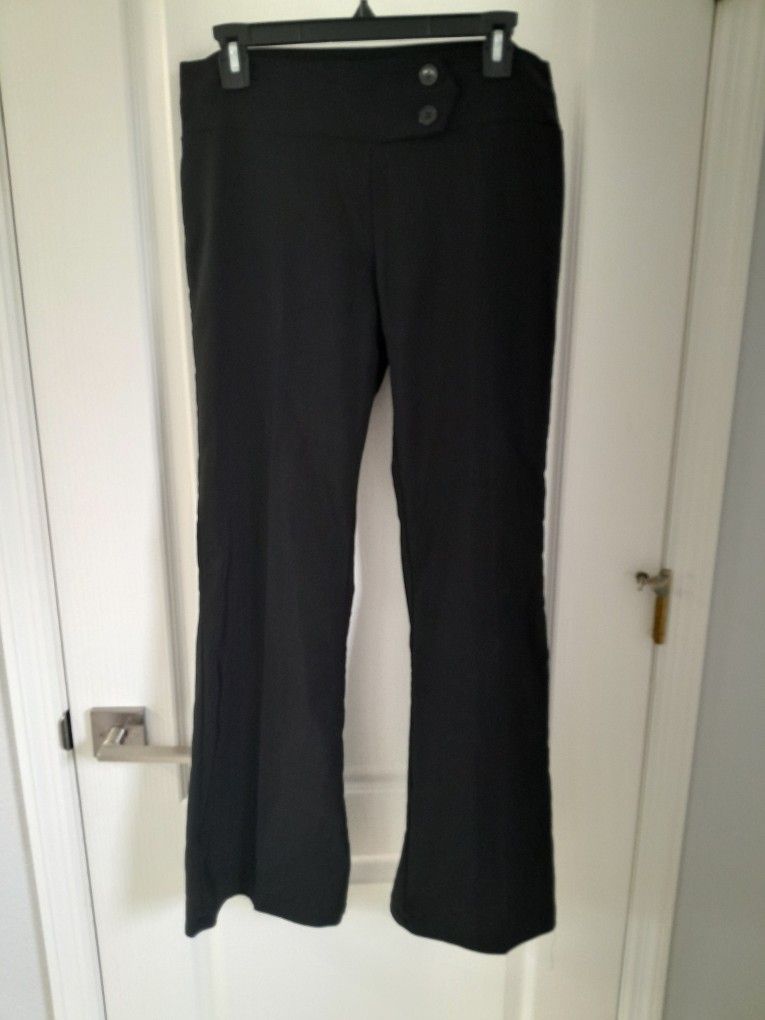 these pants are lightly used, but in good condition. they have to buttons in the front, and no pockets. they are flared, and comfortable on the waist. containing: 63% polyester 34% rayon 3% spendex