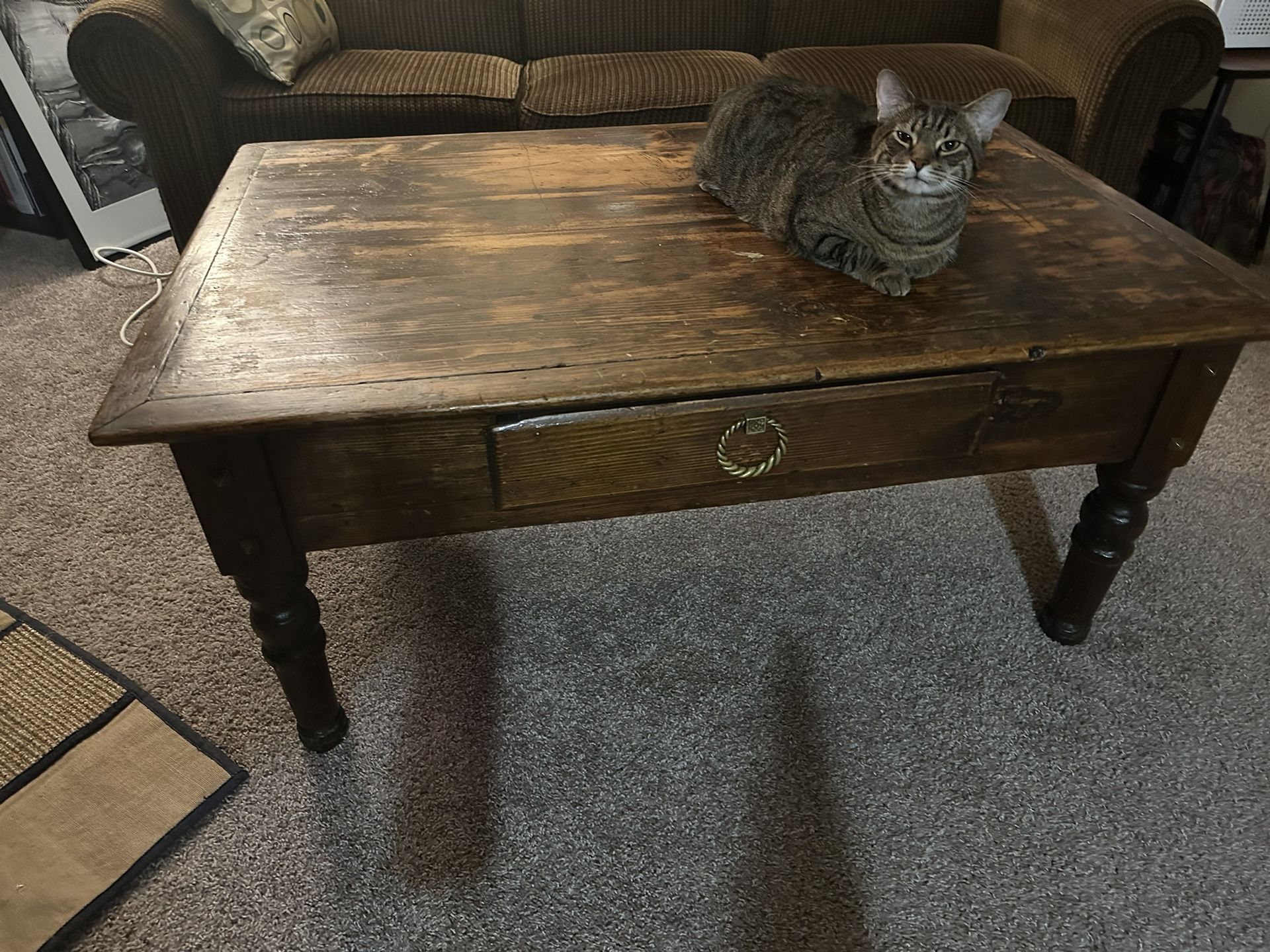 21" H x 47" L x 30.5" W Beautiful table with brass color accents. In perfect condition. It has a sizable drawer. A functional and sturdy coffee table. Must be able to pick up - bring your helpers, we are unable to offer assistance with moving it out Cats for scale, not included