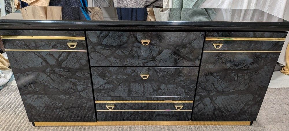 Black Lacquered Credenza/Dresser With Three Drawers And Two Doors Gold Trim And Handles.
