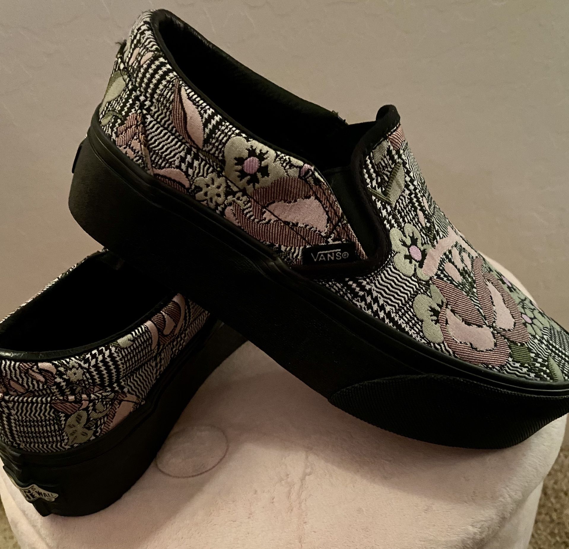 Black Hounds Tooth Pattern W/ Pink & Mauve Flowers w/ blk. Platform heel sz.6 Brand New, Never Worn.