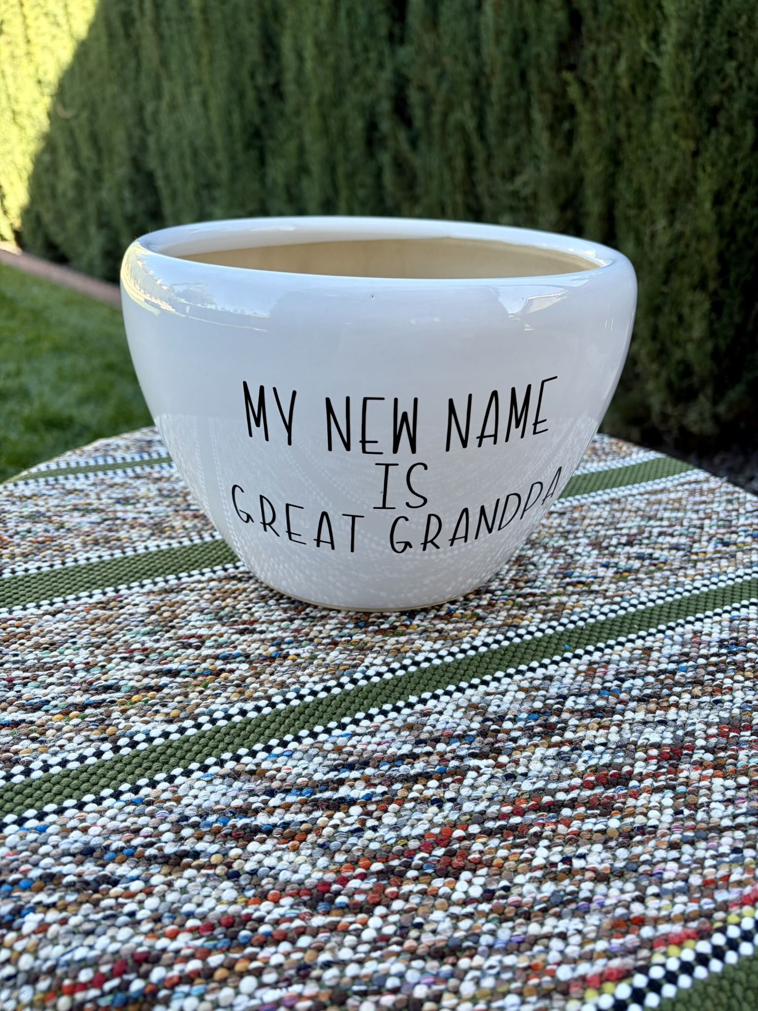 New, never used glazed ceramic planter featuring the word “hello” on one side and “MY NEW NAME IS GREAT GRANDPA” on the other side. 9” Dia. 6.25”H