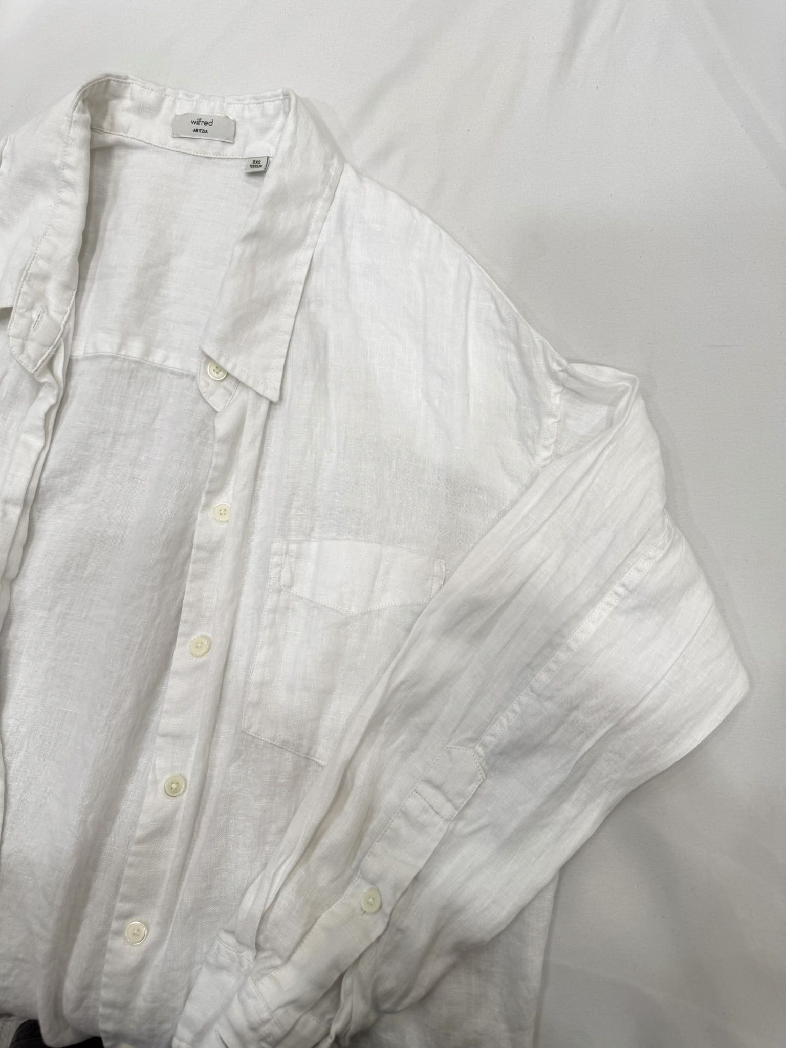 Aritzia Wilfred Relaxed Linen Shirt Color: White Size: XXS (runs big, I’m typically a size M in tops and sweaters and it was still oversized on me) Original Price: $98 Disclaimer: only worn once, wrinkled from washing and not hanging up right away