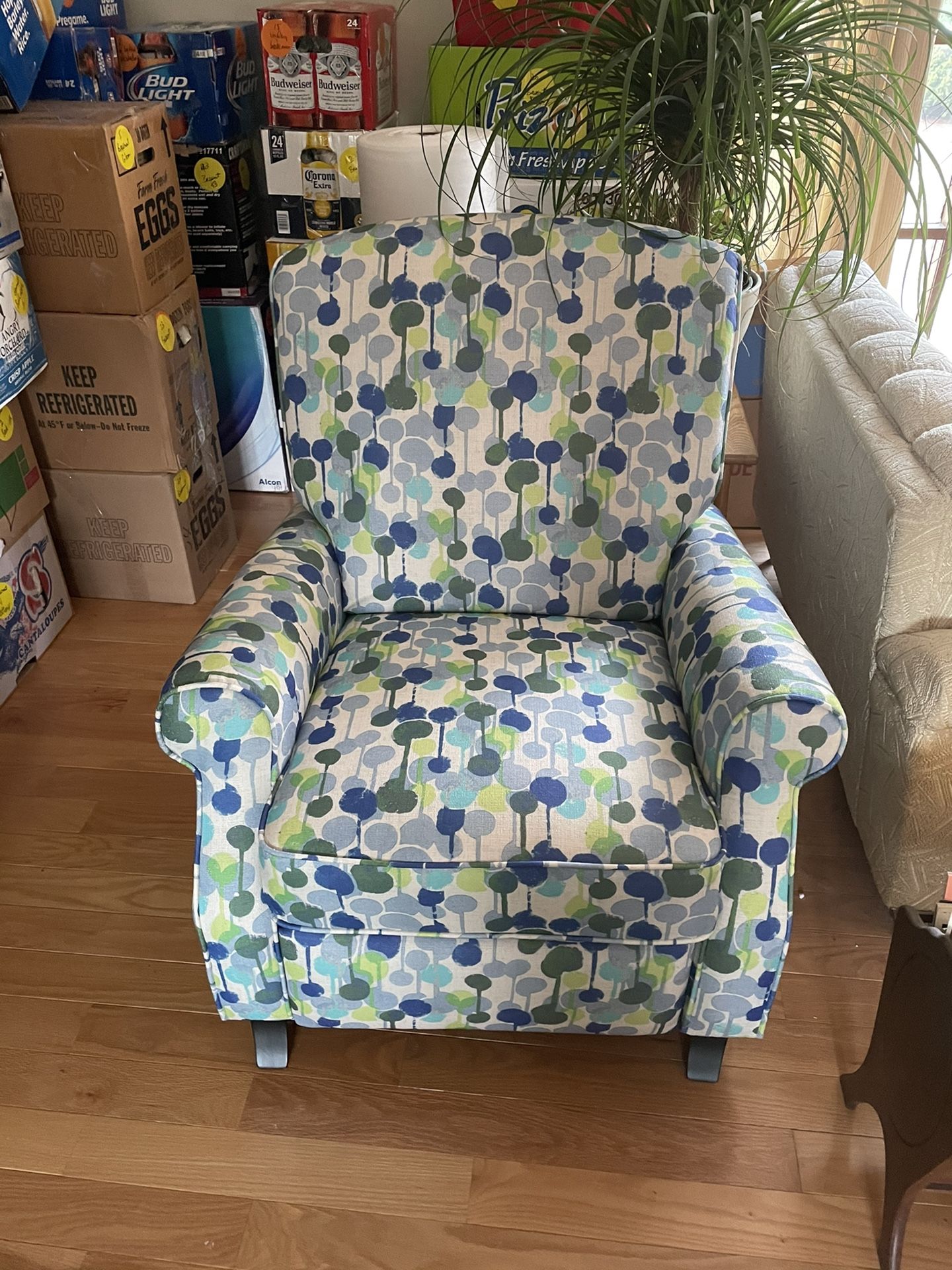 I purchased this to go with cobalt blue sofa set at my new house and it won’t fit! The sofa set takes up ALL the room ! This recliner has a small footprint doesn’t take up as much space as most. It is built for smaller folks 5’ 4” and under. I paid $414 for it and it’s never been used at all.