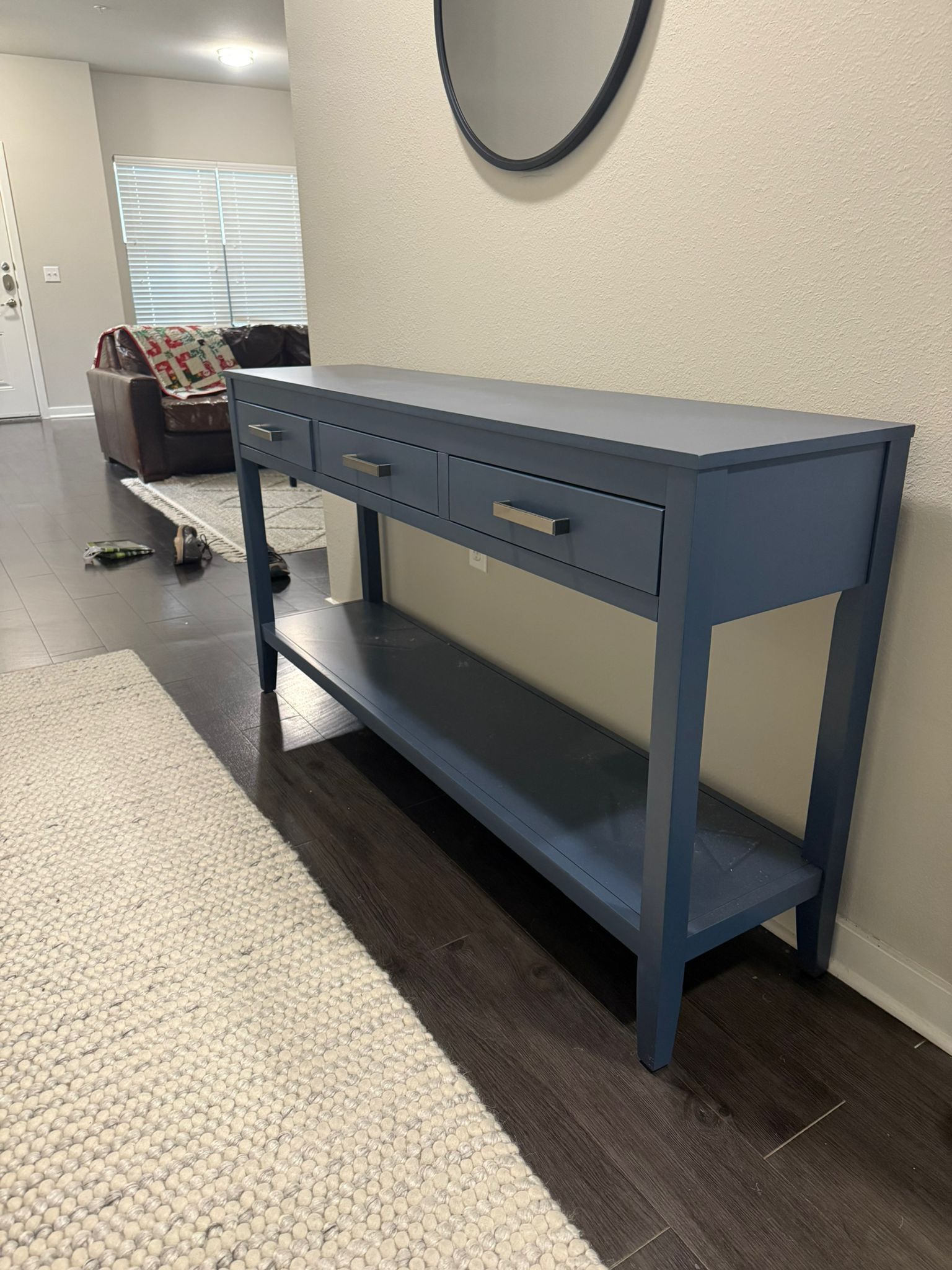 New for only a few months. Moving in with recent BF. Rug:$120 8 ft long 27 inches wide Table: $250 32 inches tall 59 inches long 14 inches wide Mirror about 24” diameter $60 Or $400 for all. Located by 35. 7330 bluff springs road