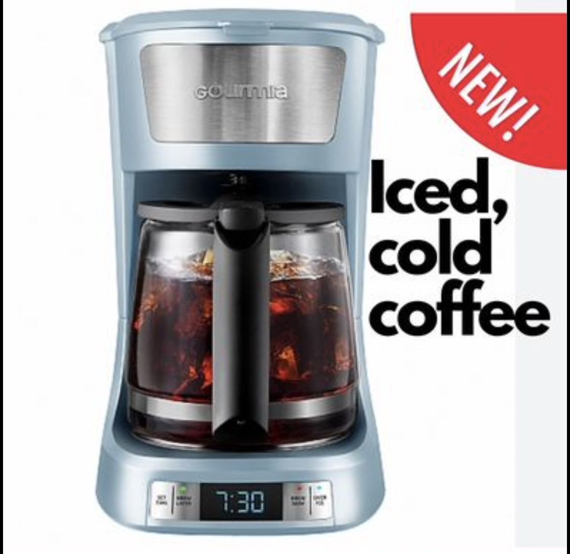 Brand new sealed in plastic Gourmia 12 cup drip color is light blue High end, eBay has one for $75 + tax Transform hot coffee to iced coffee within 4 minutes Programmable set at night ready in morning Has Pause and Serve feature Trivet and full instruction manual included