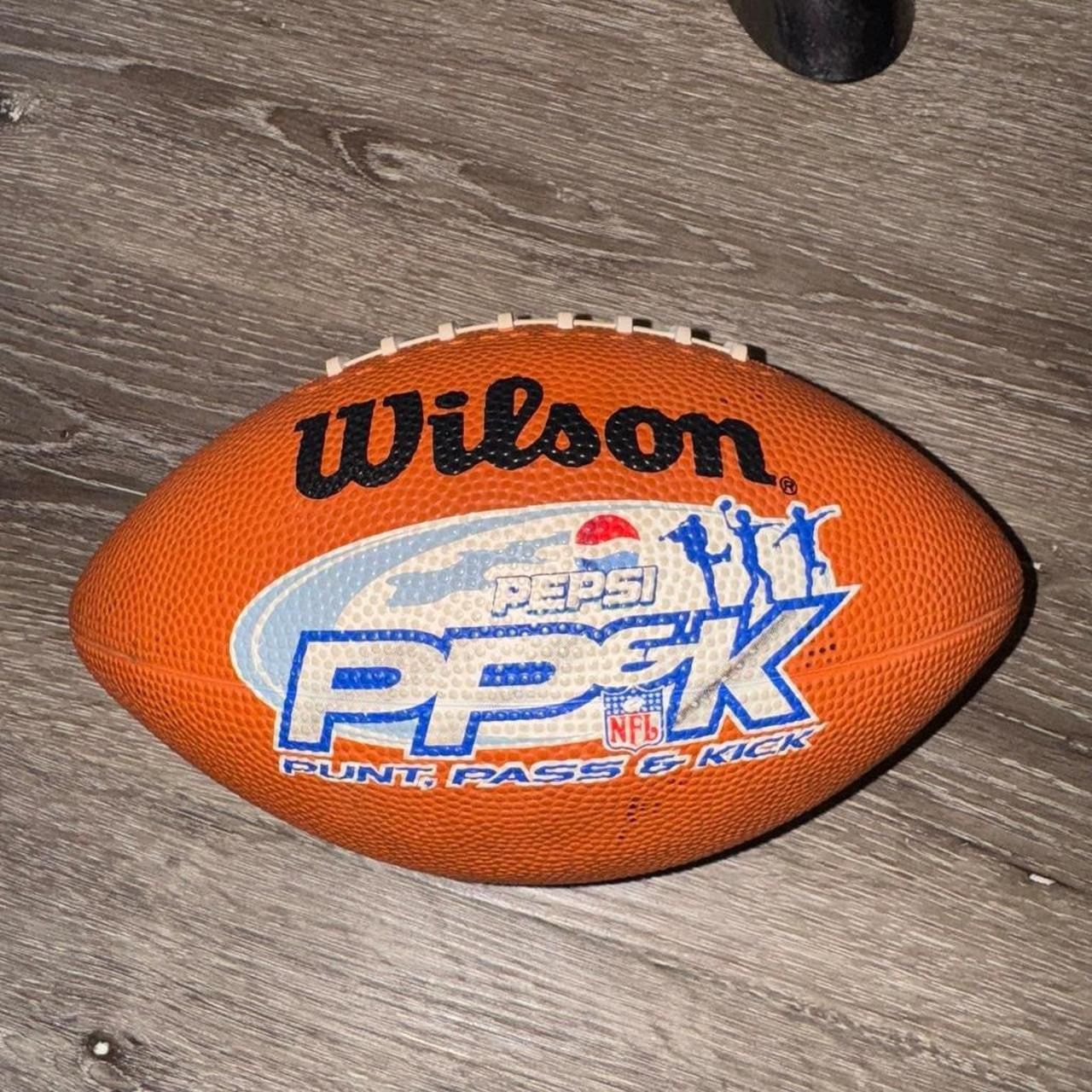 Vintage Wilson Pepsi NFL Punt Pass & Kick Football One Size This is a pre-owned Wilson football, primarily orange with a textured surface for grip. It features white laces and a prominent "Wilson" logo in black. One side displays a graphic with "Pepsi PP&K" in blue and white, along with the NFL shield logo and silhouettes of figures, indicating "Punt, Pass & Kick." The inflation valve is visible, and text around it reads "F1518 https://offerup.com/redirect/?o=V0lMU09OLkNPTQ== INFLATE TO 13 LBS. MOISTEN NEEDLE CHINA HFV." The ball shows some minor scuffs and signs of use consistent with a pre-owned item.