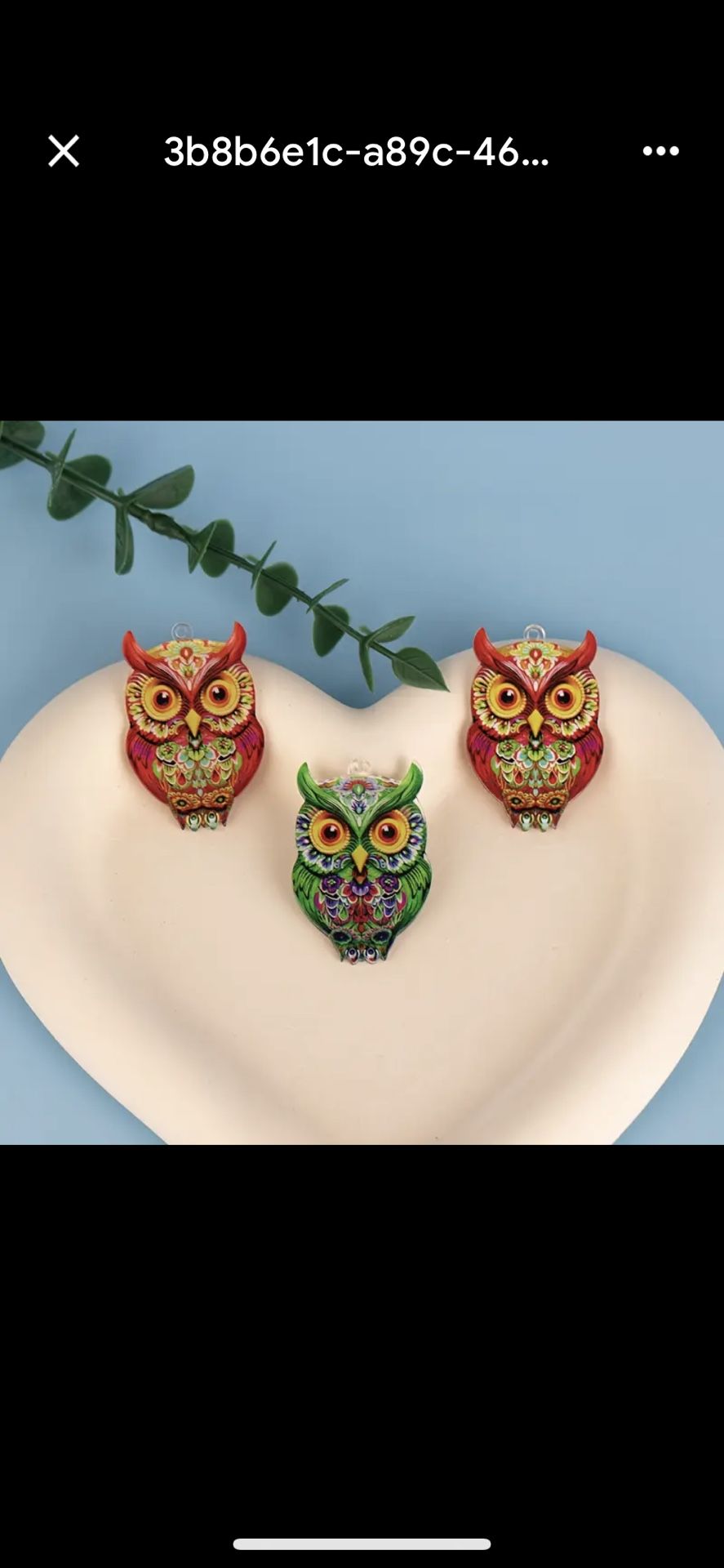 Description: Beautiful and vibrant owl charms with intricate floral details. Each one is unique and full of color. Perfect for decoration, crafts, or small gifts. Packed in a cute kraft bag, ready to give! Set of 3 for $2.