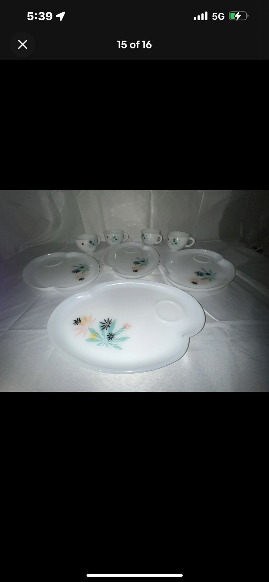 Vtg~1950s Federal Glass Patio Snack Set Atomic Flower, 4 plates, 4 cups
