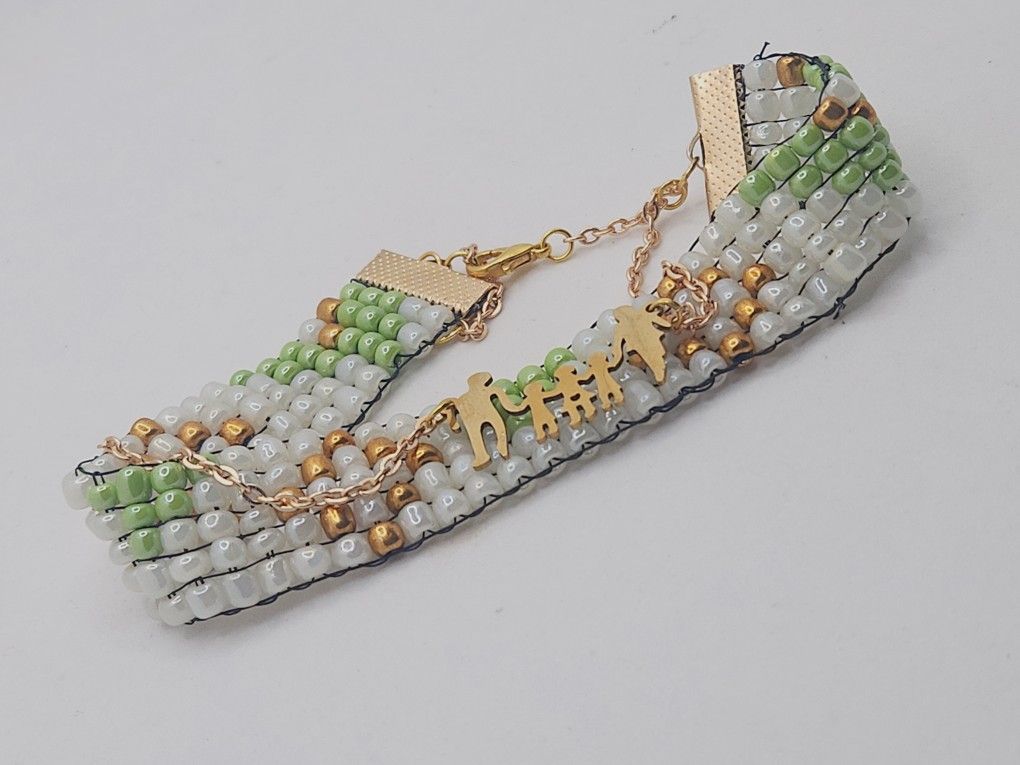 Handmade adjustable weaved bracelet with a charm of a family. Color are light green and off white and gold.