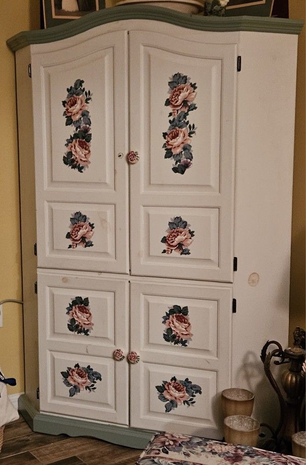 Corner Cabinet (wood), loveseat, chair, ottoman, two lampshades, two window toppers. Pet free smoke free.