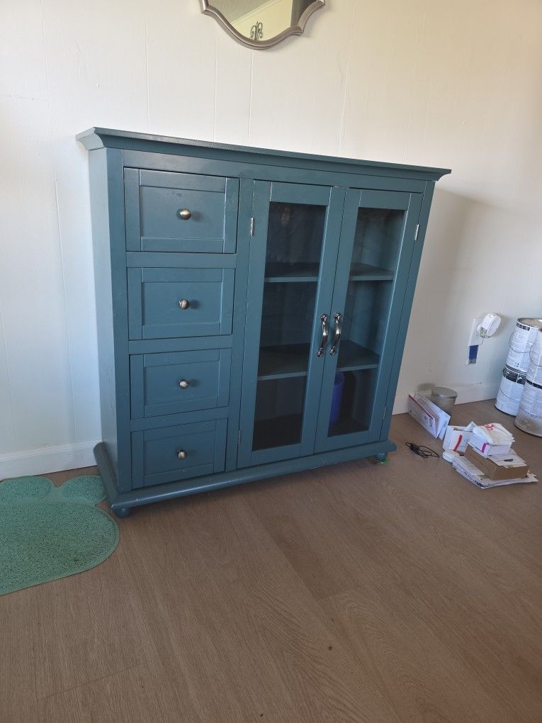 This versatile 4-drawer sideboard lets vou organize vour dining room, entryway, or bathroom while grounding your space in traditional style. The frame of the buffets & sideboards are made from engineered wooc with a crisp teal finish, and it's built on bun feet for a classic look. Two glass cabinet doors with vintage-inspired arches pull open to reveal space for dishes, linens, and toiletries On the side, four drawers with inset detailing are ideal for tucking away linens, silverware, and other personal items. Plus, this sideboard features crown molding for an extra layer of charm in your space. Product Details • Material: Manufactured Wood