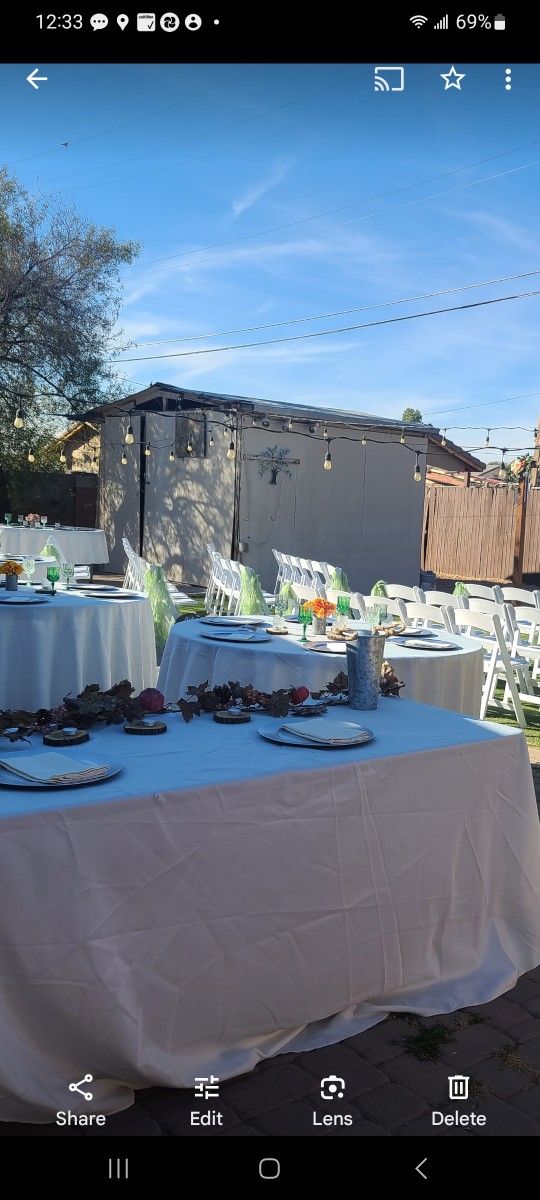 6 Polyester Tablecloths... 12 Glass Candle Votives... 6 Floral / Metal Pot Centerpieces ... Table numbers w Wood Holders... Dozen Small woodslices... 40 Sage Green Chair Sashes... 3 gallon beverage duspenser... 2 - 3 gal Galvenized Tubs... Galvanized Metal Vase... 2 Small Black board Signs... 12" Seating Sign...