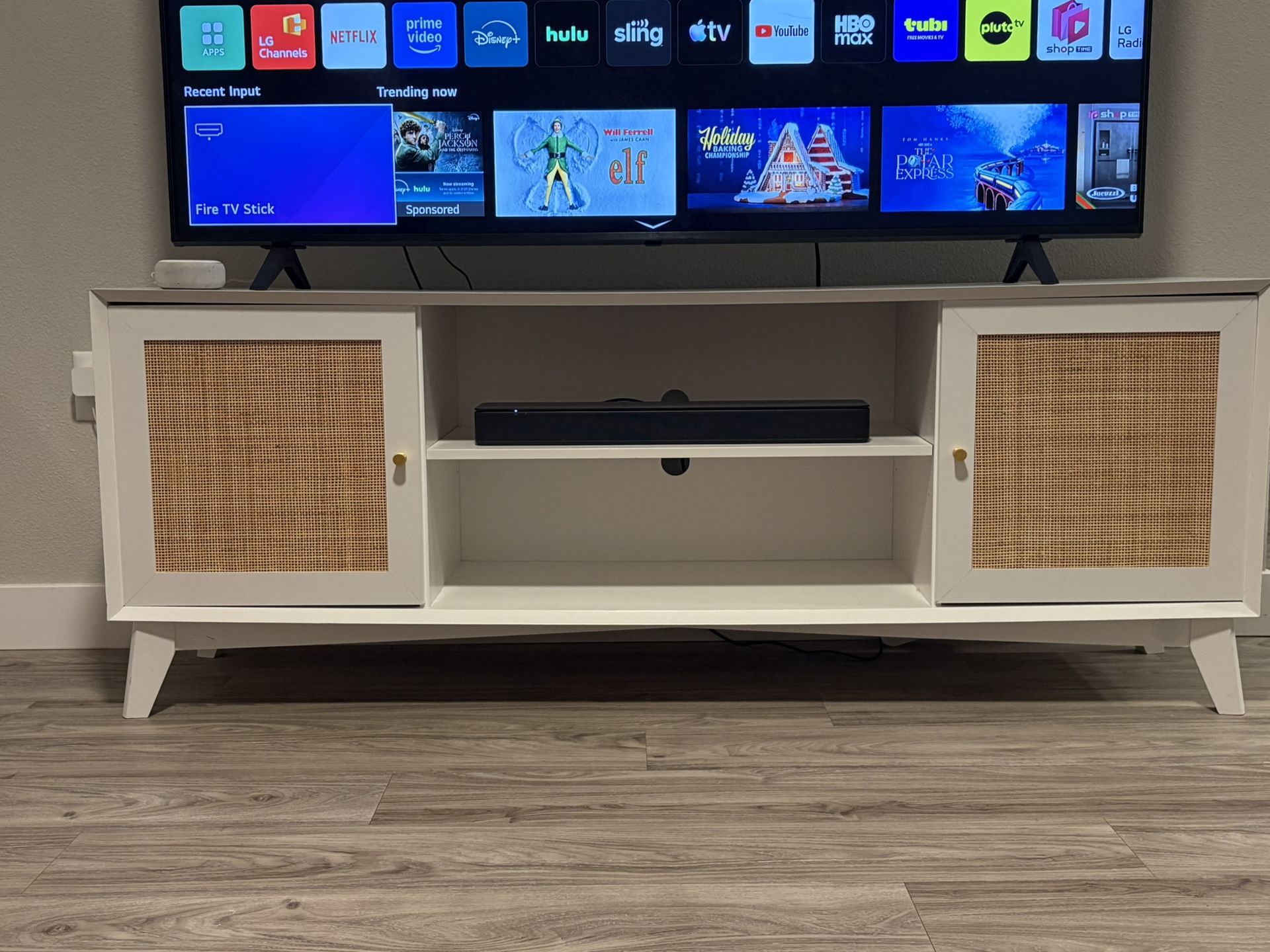 Like new- Can fit up to 75 inch TV, weighs about 94 pounds Dimensions: 66x15.7x 25 inches Height: 25 inches Color: White Shape: Rectangular Cabinets: Soft closing hinges