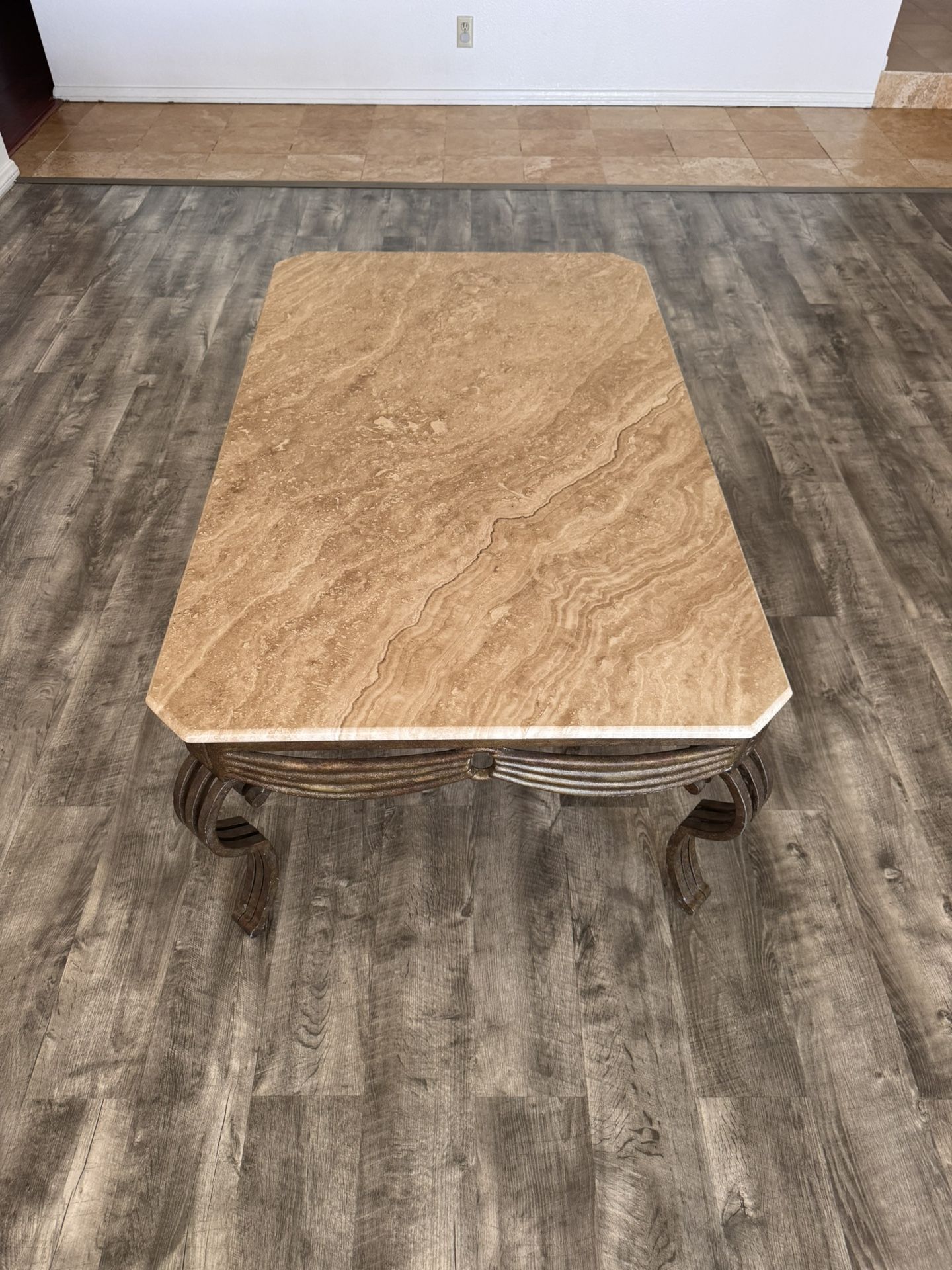$1,500 OBO High-quality matching 2-piece designer table set featuring solid natural travertine stone slab tops on heavy forged iron bases. This is gallery-grade imported stone furniture — not veneer, laminate, or imitation stone. Comparable new stone & iron designer sets today retail $3,500–$6,000+. ⸻ Set Includes • Coffee table • Matching end table (Lamp not included) ⸻ Details • Solid travertine slab tops • Thick beveled stone edges • Heavy forged iron bases • Old World / Mediterranean designer styling • Extremely solid and heavy • Natural stone veining — each piece is unique ⸻ Approximate Sizes Coffee: 48” W × 30” D × 18” H End: 28” W × 28” D × 22” H ⸻ Condition Excellent. Clean stone, no cracks or repairs. ⸻ Pickup Local pickup in Hesperia — very heavy. Bring help and a truck.