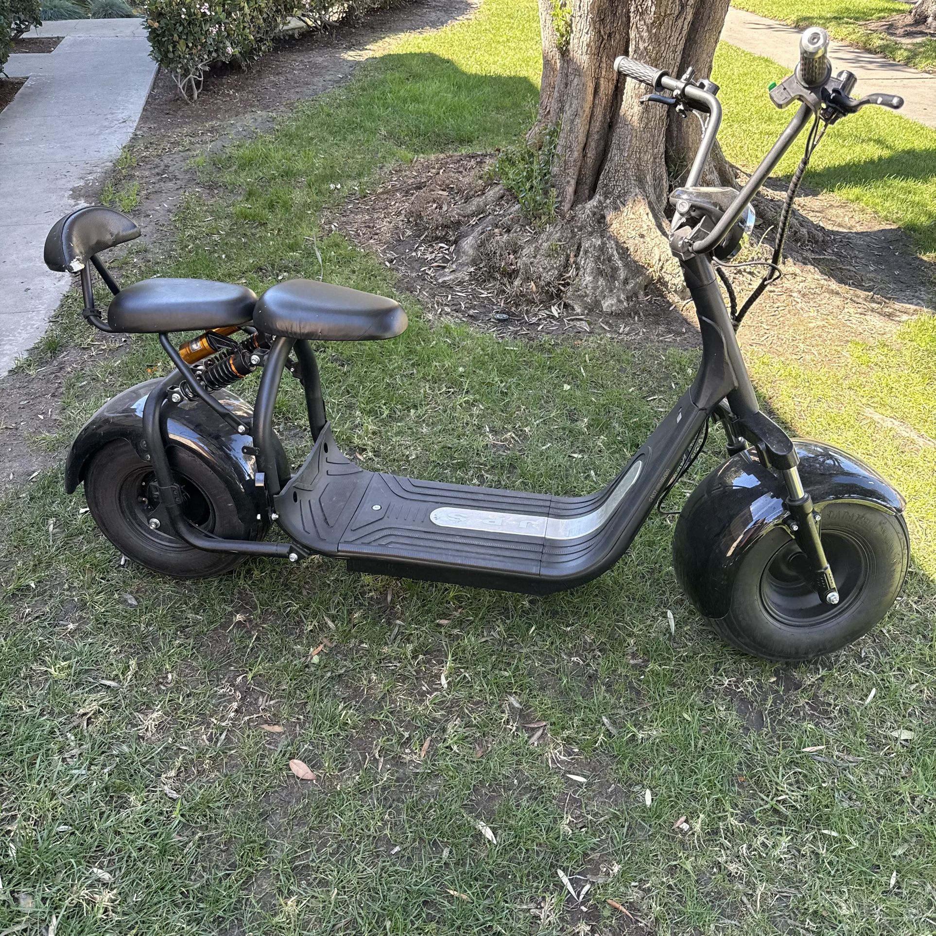 60v 2 seater electric scooter. 750w rear wheel drive motor. Up to 28mph, max carrying capacity of 330lbs. Removable battery and possible to add a second battery to get more riding hours between charges. Comes with 2 full sets of keys, original charger, tool back plus a bag with complete replacement screws and bolts for entire bike. Minor wear and tear from normal use, no wrecks. Biggest blemish is a small tear on the passenger back rest (all damage and scratches are circled in red in photos). Paid $1450 for it a year ago (new from store, not used). Would like to get $500 for it, but I’m willing to take a little less with possible trade.