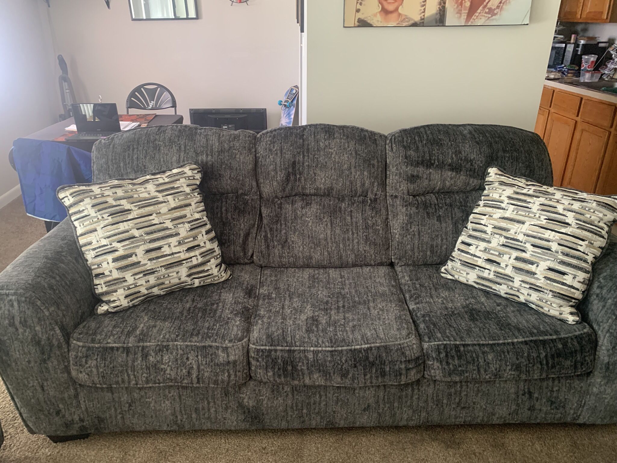 Hey I got an excellent Couch and Love Seat made by Ashley Furniture barley sat on and a non smoker with matching pillows that come with it