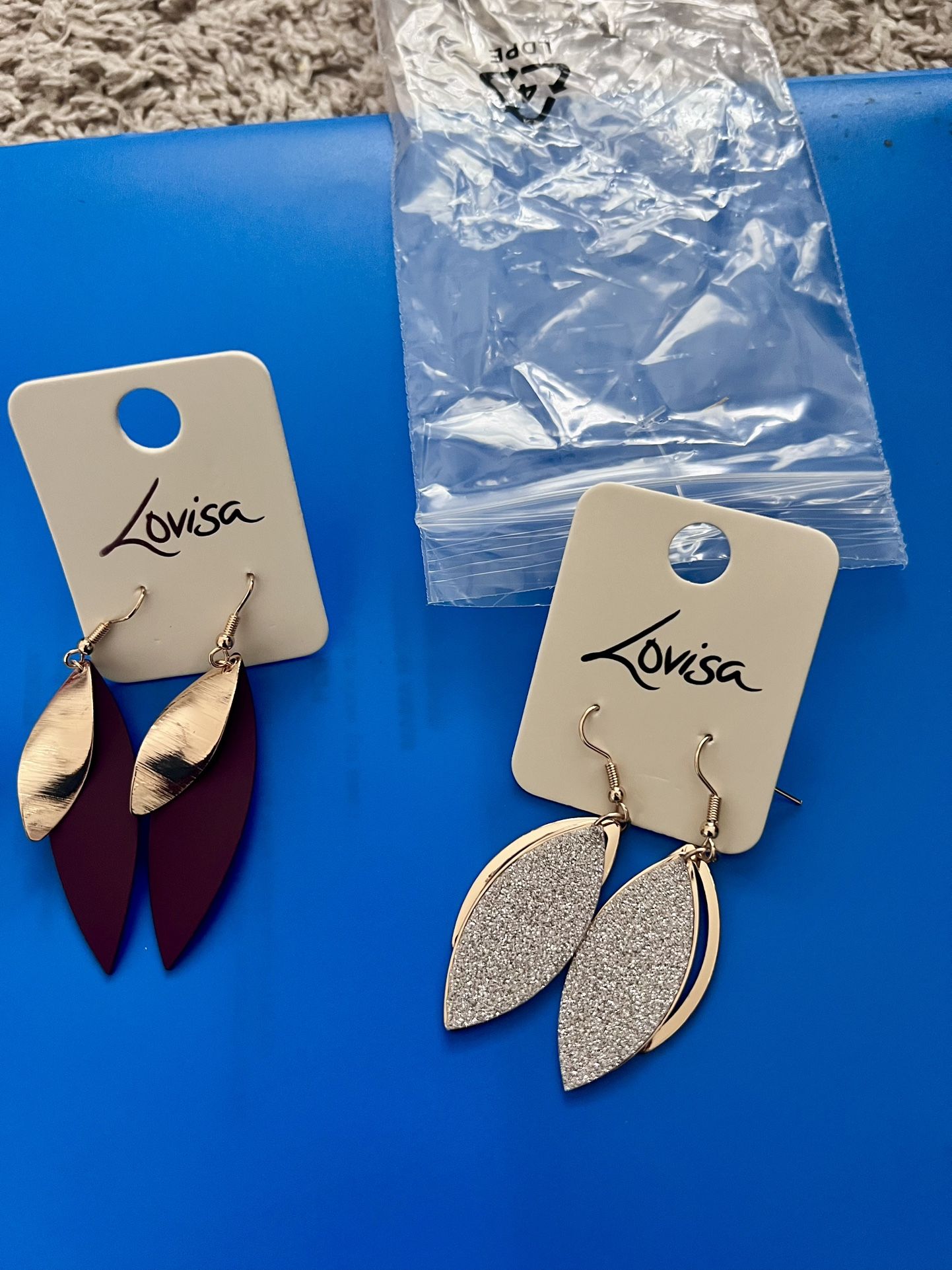 I have 10 pairs of each style. I ordered for giving gifts but now not able to return. They are brand new, never worn. Still in the original packaging. Maroon long double leaf earrings $5 each Glittery Leaf Gold Drop Earrings $8 each If you buy all, price is negotiable.