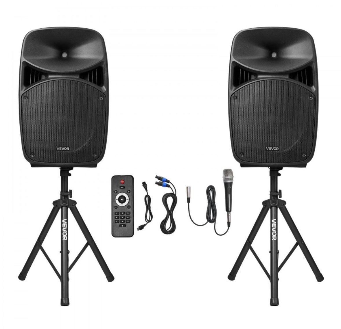 Vevor 15” Powered PA Speakers Pair w/ Stands, Cables & Microphone Bluetooth NEW