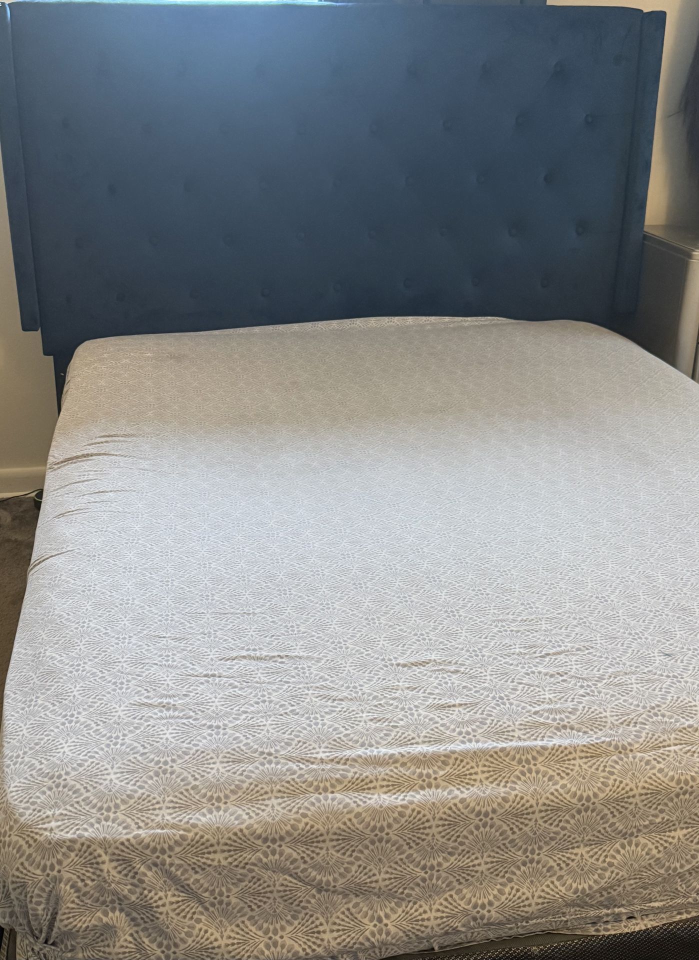 Queen Velvet Blue Bedframe alongside Mattress and Boxspring. Very durable and very good condition. No signs of wear. Price is slightly negotiable. Moving hence selling.