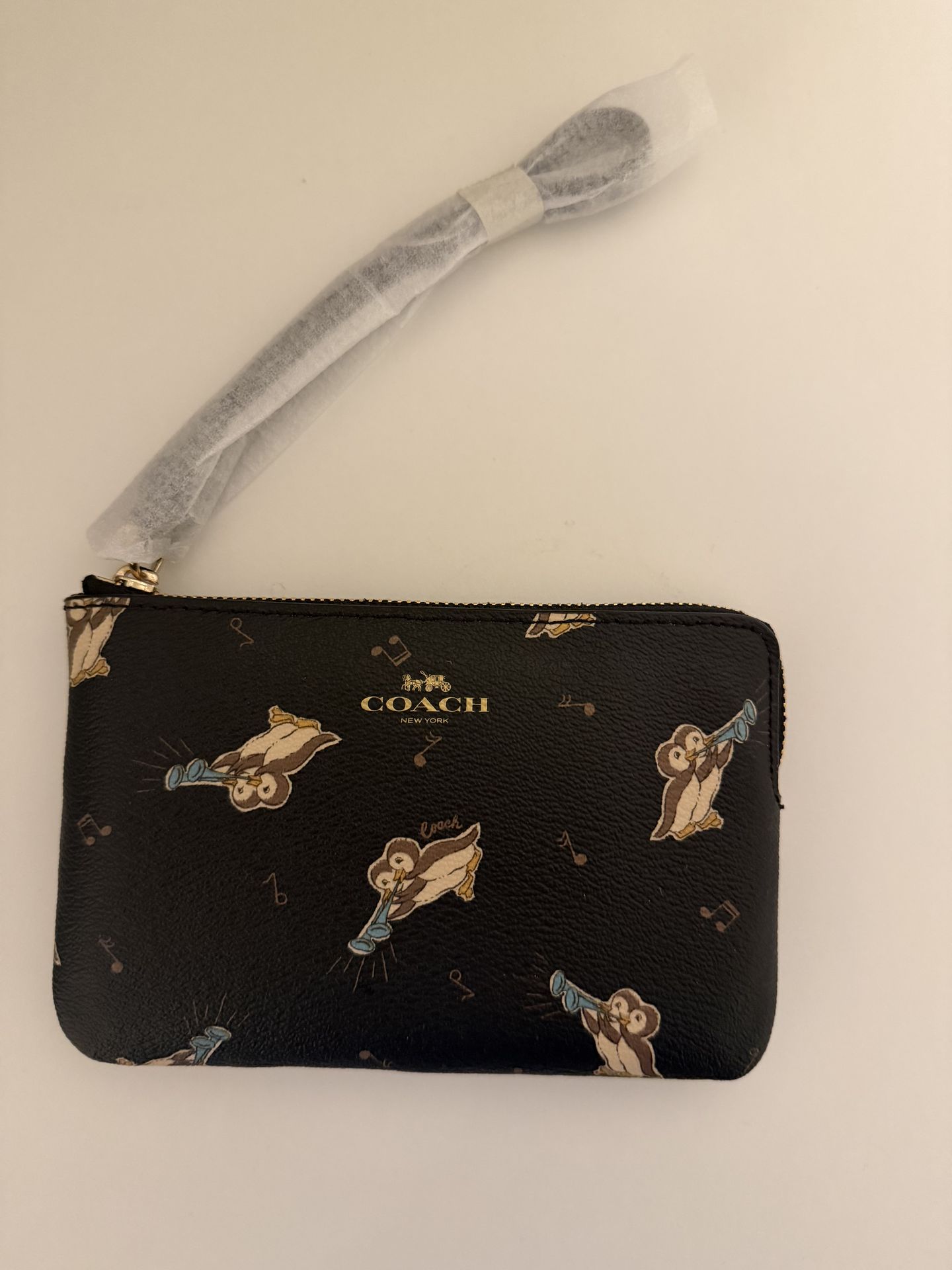 Brand New!!! Authentic Coach Musical Penguins Print Corner Zip Wristlet / Wallet / Coin purse * Limited Edition SOLD OUT musical penguins playing trumpets design ❤️ * Each wallet's print design is unique! * Matching tote also available for bundle! * Color: B4/Black Multi * Polished pebble leather * Zip-top closure with gold hardware * Two credit card slots * Maroon fabric inner lining * Detachable strap * MSRP $85 Dimensions: 7.5" L x 0.5" W x 4.75" H