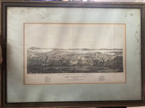 Antique 1856 Lithograph "San Francisco" by Henry Bill – Original 19th Century Panorama Print Step back in time with this rare and stunning original lithograph of San Francisco, dated 1856, published by Henry Bill of New York. This detailed panoramic view captures a historically rich moment in San Francisco’s early urban development, with landmarks such as Yerba Buena Island, the California Exchange, Rincon Point, and Angel Island clearly labeled at the bottom of the print. This piece was published for “The History of the World” and is believed to be an authentic three-color stone lithograph, based on documentation from Lyons Ltd. Antique Prints (label attached on reverse). The presence of visible center folds and natural aging—such as toning, foxing, and soft creasing—further supports that this is not a modern reproduction but a genuine mid-19th-century print. These characteristics are consistent with original lithographic prints of this age. 🖼️ Details: Title: San Francisco. 1856. Publisher: Henry Bill, New York Medium: Lithograph (likely original three-color stone) Approximate Era: Circa 1856 Size (including frame): 23.5" x 17" Features: Labeled city landmarks, historic topography, antique wooden frame with matting Framing: Professionally framed by Frame It Shops & Gallery (Citrus Heights / Carmichael, CA) 📌 Condition: Overall good vintage condition for its age Visible historical creasing (consistent with original lithograph folds) Some age-related toning and spotting around the border Frame and mat show light wear appropriate to age Still displays beautifully and ready to hang This is a museum-worthy piece of California Gold Rush history, ideal for collectors of antique maps, Americana, or early San Francisco memorabilia. Original Henry Bill lithographs are increasingly hard to find, especially in this condition with documentation. . . . . .