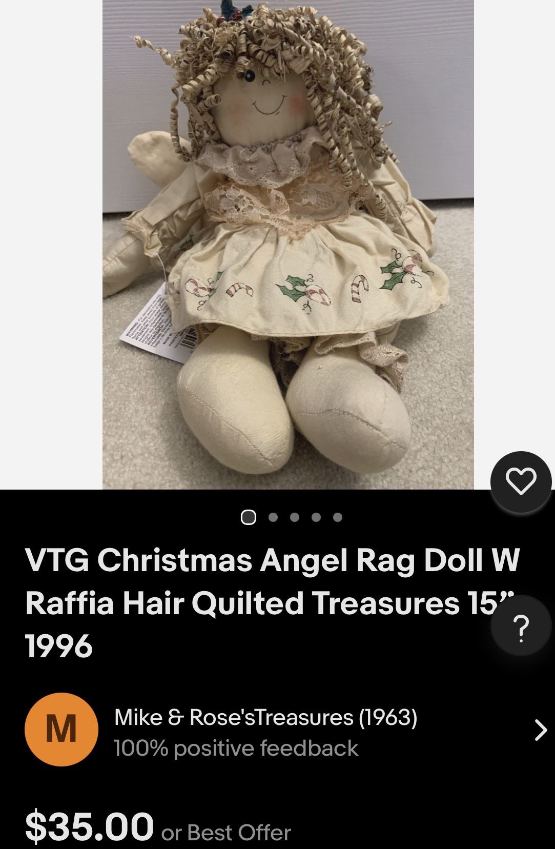 Vintage Christmas Angel Rag Doll Raffia Hair Quilted Treasure 15”