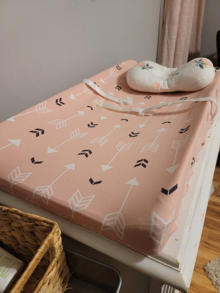 Like new baby changing table pad/mattress Includes FIVE Slip Covers (unisex colors) ALSO INCLUDES A PILLOW FOR BABYS HEAD -Washed & Ready to Use- Very Clean- Barely Used, Very Good Condition Over $80+ Value if sold separately Message for details